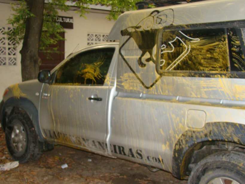 Passamos por 2 bloqueios e furamos os 2. Colombiano pode ser ruim, mas brasileiro é péssimo. Joguei o carro em cima e mentalizei o strike. Os malandros saíram da frente mas jogaram sacos de lama no carro. O Tapa ficou puto.