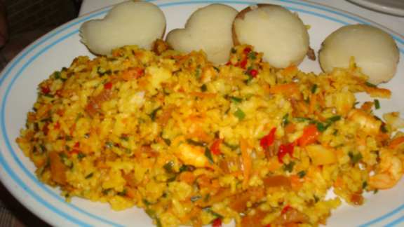Comemos também arroz com camarão. Incrível, mas esse prato farto e suculento nos custou menos de R$ 11,00, e veio acompanhado de batata cozida.