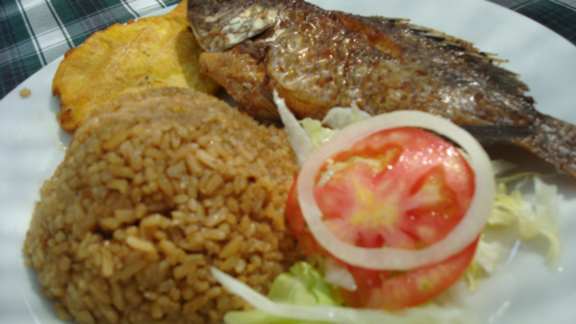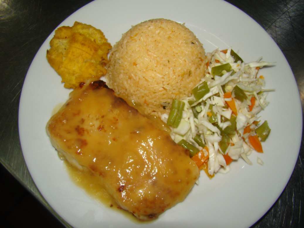 Outro prato que comemos neste mesmo lugar, e pelo mesmo preço do “Churrasquito”, foi o “Pescado do Dia”, composto por peixe, arroz com coco, salada e patacones.