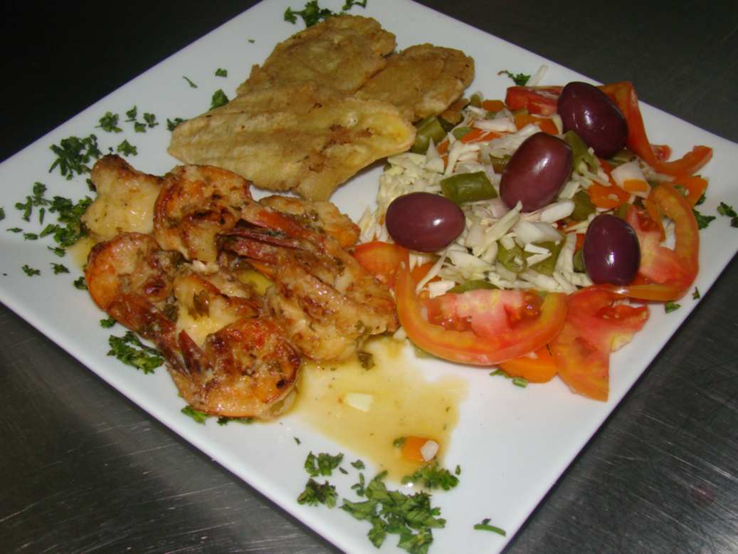 O outro prato foi “Lagostino À Cartagena”, camarões deliciosamente preparados ao molho de ervas, salada e patacones...