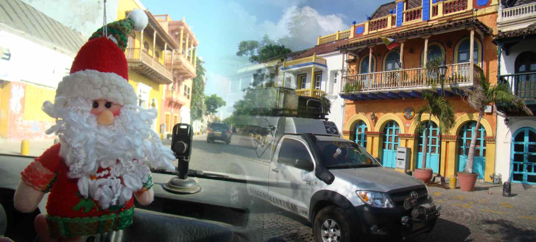 O Farofamóvel já tem decoração de Natal. Um Papai Noel com uma barba enorme atrapalha a minha visão no complicado trânsito colombiano. Coisa da Ana.