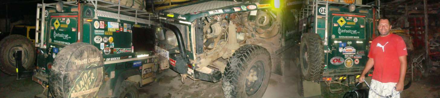 Estacionamos o Farofamóvel e lá estava um Land Rover australiano com a frente do carro batida. O volante do carro era do lado direito! E os caras também estavam dando a volta ao mundo! (http://www.heartofdarkness.com.au)