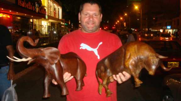 Ali perto tinha um cara que fazia umas esculturas lindas, de madeira maciça, de animais. Tinha touro, elefante, rinoceronte. Todas perfeitas.