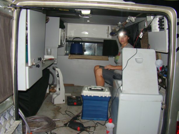 Aproveitamos para desmontar a cabine para tirar uma goteira da parte hidráulica. Tiramos de letra e a Ana já tem a manha de trabalhar com as ferramentas. De vez em quando a gente tira a cama de dentro do carro para retirar a pentelhada negra do Tapa. É muito pentelho. Muito. Pentelho demais.