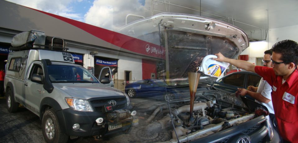 Depois a missão foi trocar o óleo. E como o óleo é diferente nos carros a diesel, tivemos que catar um lugar que topasse fazer isso. Encontramos um lugar chamado Jiffy Lube, onde os caras trocaram o óleo, o filtro, revisaram todos os fluidos, aspiraram o interior e encheram os pneus. Tudo isso em apenas 6 minutos. Impressionante! Na hora de entrar no carro eles colocaram um tapete vermelho no chão para mim e para Ana entrarmos no carro, e desejaram sucesso na viagem.