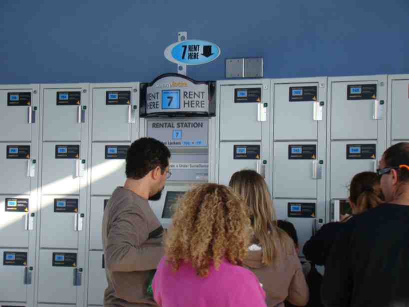Como não dá para carregar a bolsa nestes brinquedos, armários são espalhados pelo parque e custam cerca de 2 dólares a hora.
