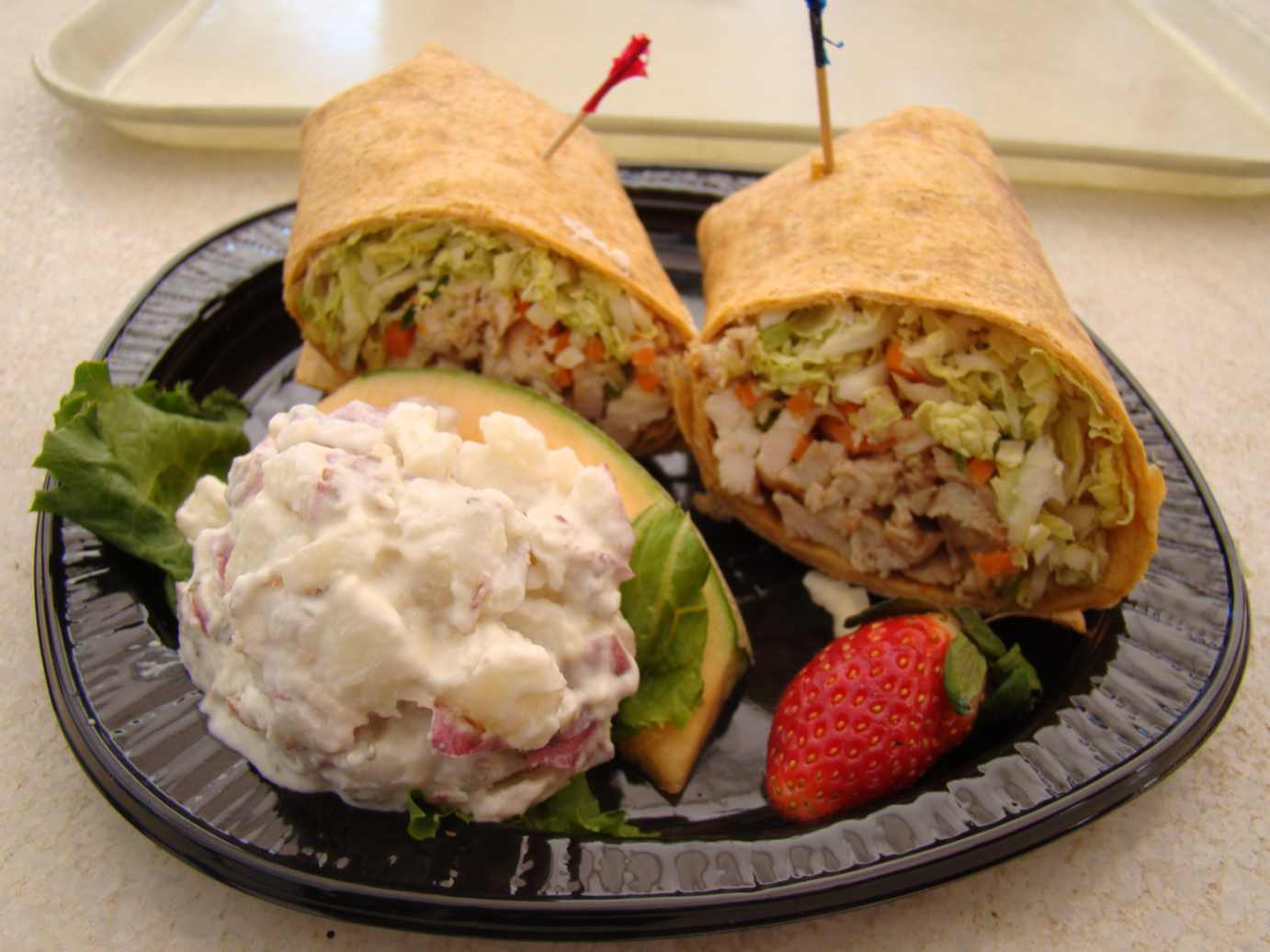 - Tempo de preparo: 10 minutos - Ingredientes: 8 fatias de pão branco fatiado Peru cozido fatiado 2 latas de creme de cogumelo ½ xícara de água ½ xícara de queijo cheddar fatiado 8 fatias de bacon levemente cozidos - Modo de preparo: Separe as fatias de pão numa travessa para ir ao forno após o preparo dos ingredientes. Torre as fatias de pão em torradeira ou forno, duas fatias por sanduiche. Colocar o peru fatiado no pão, e agregar água ao creme de cogumelos no forno deixando-o cremoso até aquecê-lo totalmente. Com uma colher, espalhar o creme de cogumelos em cima do peito de peru, e polvilhar o queijo cheddar por cima. Cobrir o sanduiche com uma fatia de bacon. Levar os sanduiches ao forno até o queijo derreter. Servi-lo ainda quente. Bom apetite!!! Os wraps também fazem sucesso aqui, e também são servidos com uma porção de maionese, não sei por quê. Esses sanduiches são super simples de fazer em casa e pode levar o ingrediente que a gente quiser, o importante neste tipo de sanduba é usar um bom pão árabe ou similar para conseguir enrolar direitinho. Aqui nós provamos um de frango com salada.