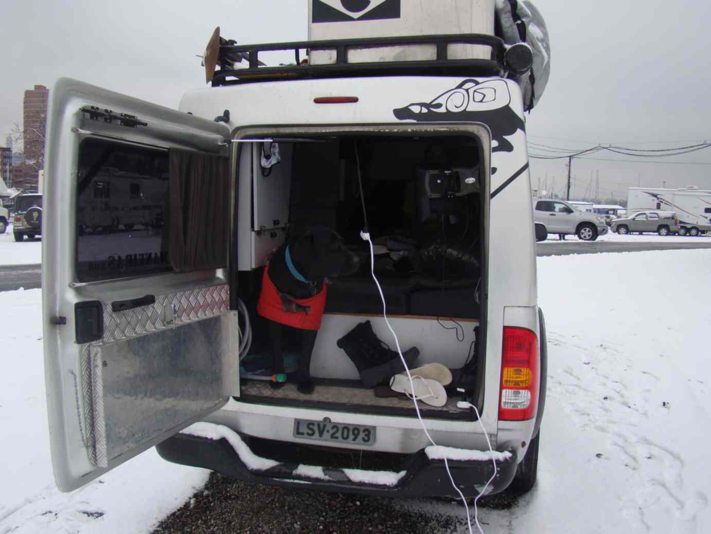 Assim que tentei sair do carro, uma rajada de vento fez com que a porta abrisse rápido demais e o amortecedor rasgou a fibra e quebrou. Neste dia inteiro nem saímos do carro.