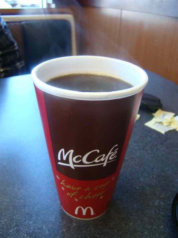 Um parênteses para os cervejeiros de plantão. Bebida nos bares do país, na grande maioria dos estados, é só até às duas da matina. Quando dá essa hora, em ponto, quem estiver te atendendo vem e toma todas as bebidas alcoólicas que estiverem em sua mesa, não importa se ainda estiver fechada ou algo parecido. Eles tiram mesmo. E aos domingo não se vende bebida alcoólica, ao nem ser em bares e restaurantes. Então, caso você queira comprar e levar pra casa ou hotel, sei lá, abasteça sua dispensa até sábado ou espere o inicio da próxima semana. Americanos tomam muuuito café, muito mesmo. Tanto que a maioria das embalagens são enormes, vejam esta do Mc Donalds que absuurdo! Hehe.