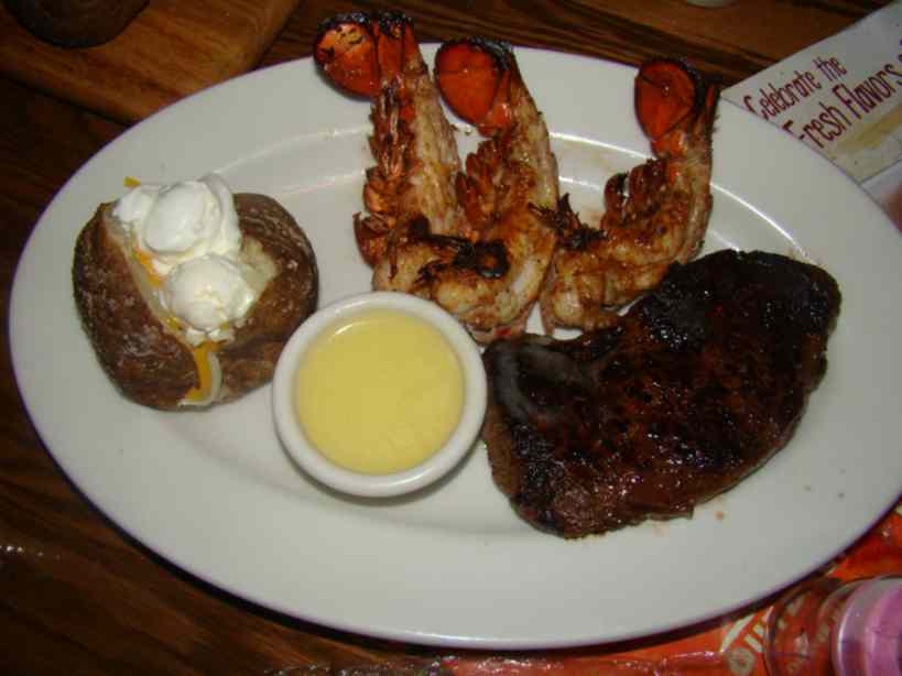 Eu e Gustavo comemos a melhor carne de nossas vidas lá. Pedimos um prato para nós dois que veio com camarões, purê de batatas com muito alho e um bife de filet mignon que estava para lá de especial. Não vai dar para mostrar foto, pois quando lembramos de registrar uma imagem deste magnífico prato já havíamos dado umas mordiscadas. Pelo menos dá para atiçar sua imaginação só pensando em como foi comer esta maravilha! Hehehe Outro prato super pedido no Outback daqui é com lagostas, filet mignon e batata recheada! A gente não comeu, mas nossos amigos que comeram disseram estar maravilhoso. Por isso, segue uma lembrancinha...