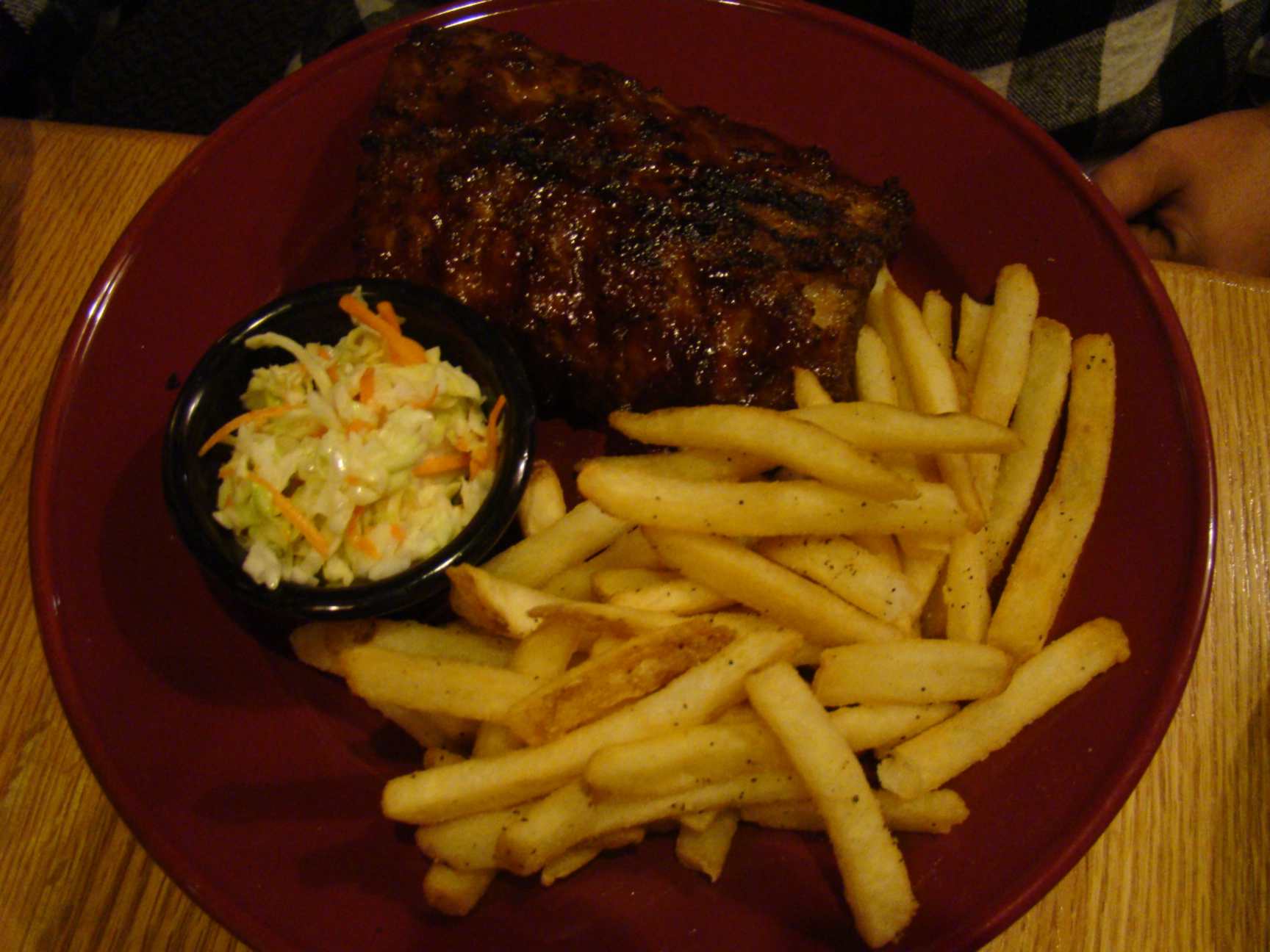 E também, costelinha com batata frita e o que eles chamam de “salada” da casa.