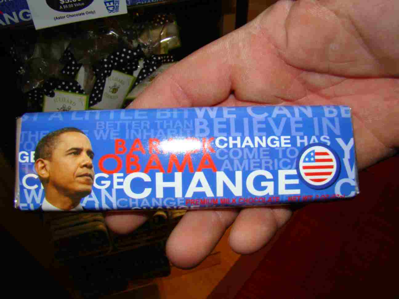 Aqui vimos o chocolate do Obama. Isso não é nada... em NY vendem preservativo do Obama! Ele é o garoto propaganda preferido da América.