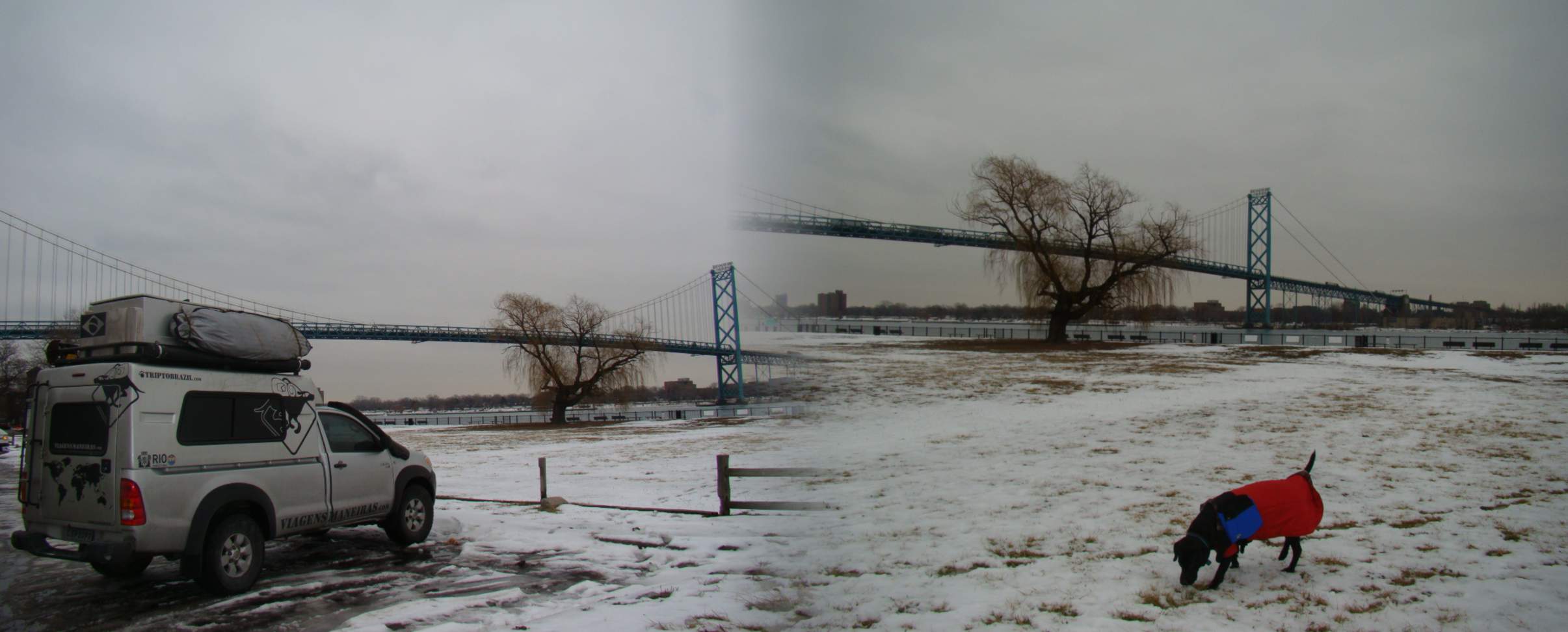 Depois do Niágara, nossa primeira parada foi Detroit. Ahh, o Tapa agora tem uma mochila para ele carregar sua ração e os pratinhos de comida e água.