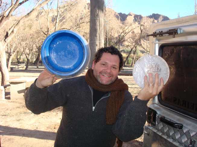 Acordamos no dia seguinte congelados, assim como a água do Tapa, que virou uma pedra de gelo do lado de fora do carro. E o vento continuava muito forte. Uma poeirada danada. Tinha uma árvore perto do carro que ficou cheia de gelo.