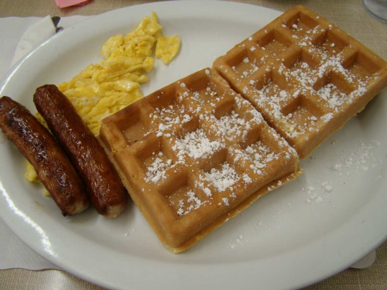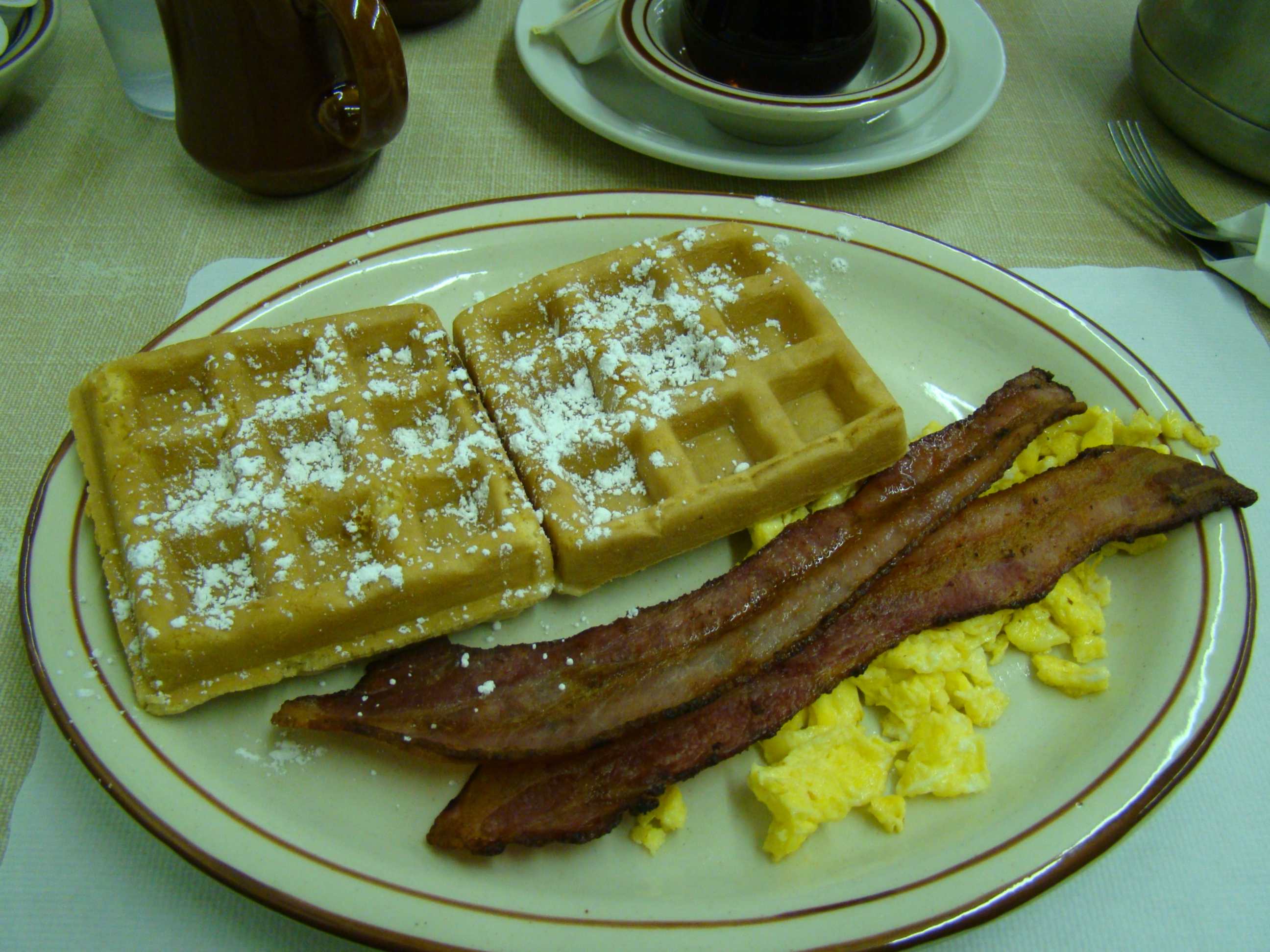 Pedimos dois combos waffles que nos pareceram os mais “saudáveis” de todos... mas, haviam apenas duas opções nos combos: vir com bacon ou lingüiça !!??