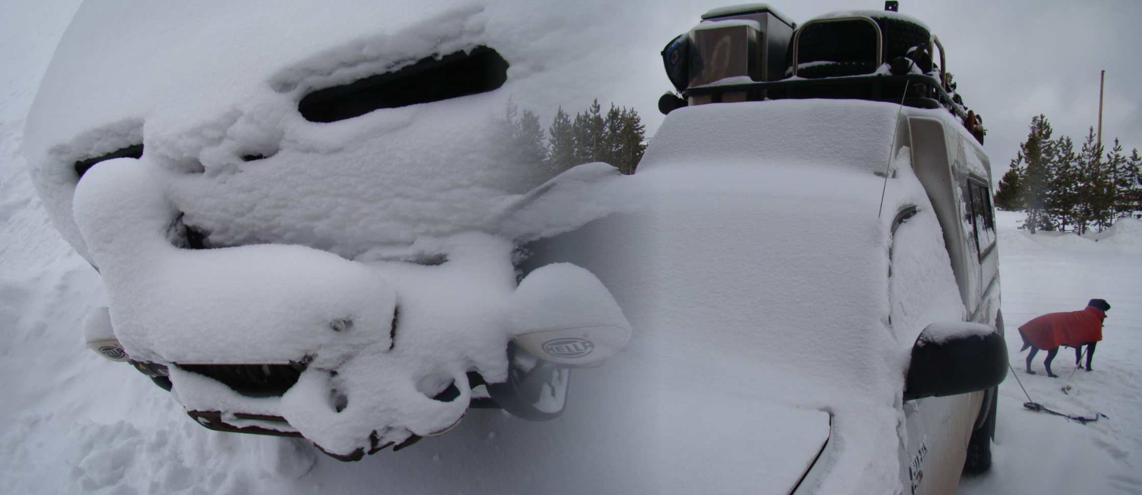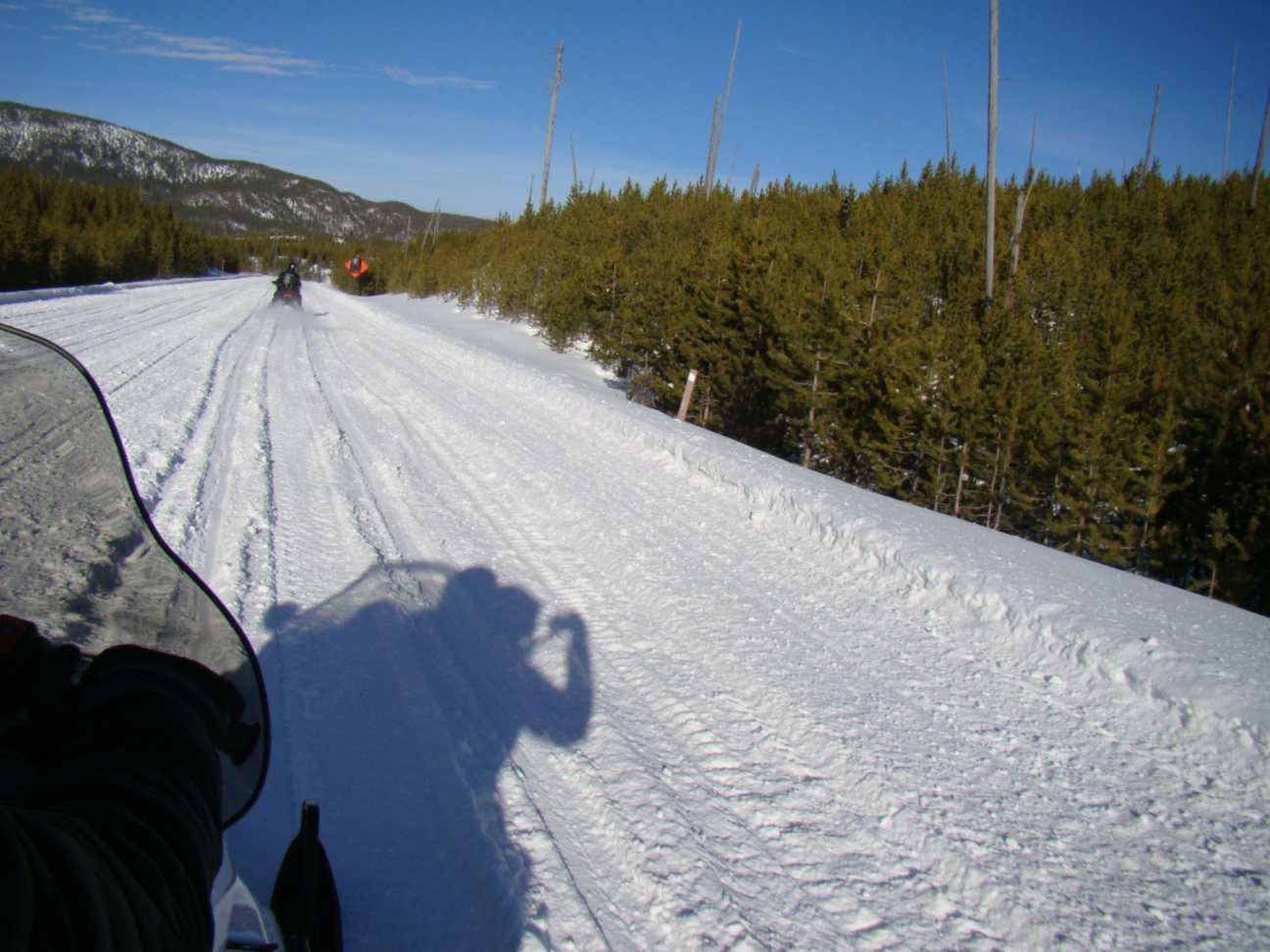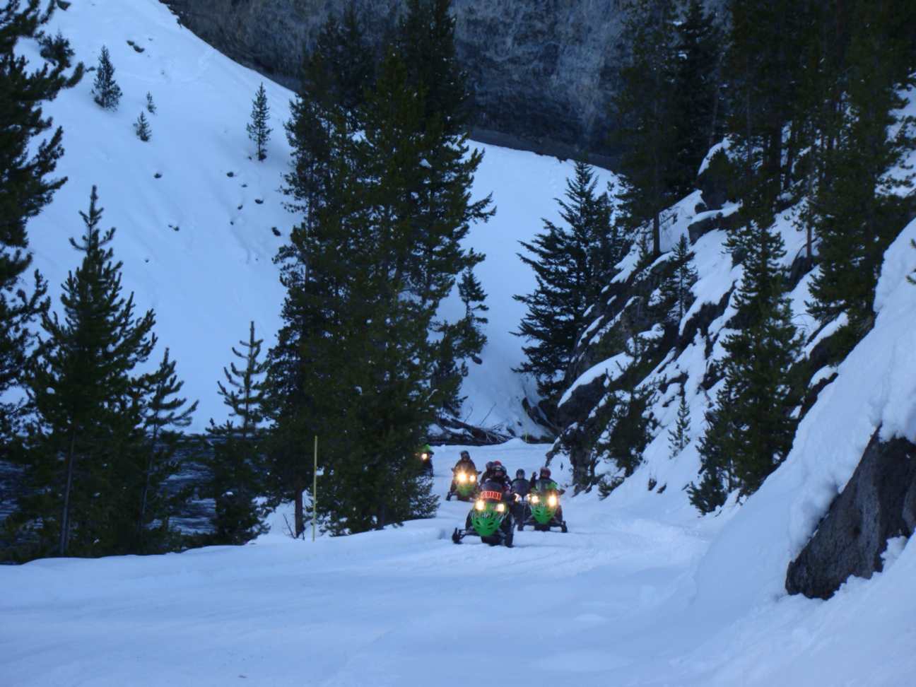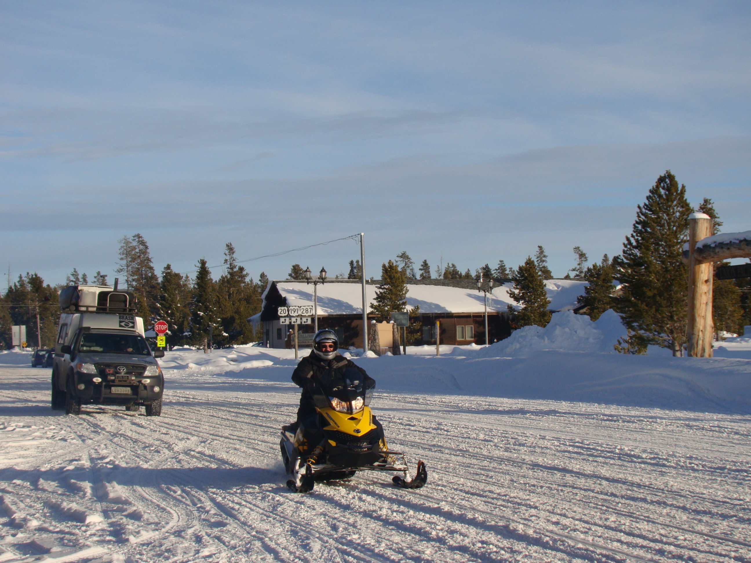 Como a neve é profunda, as únicas formas de entrar no parque são de snowmobile ou em carro com esteira.