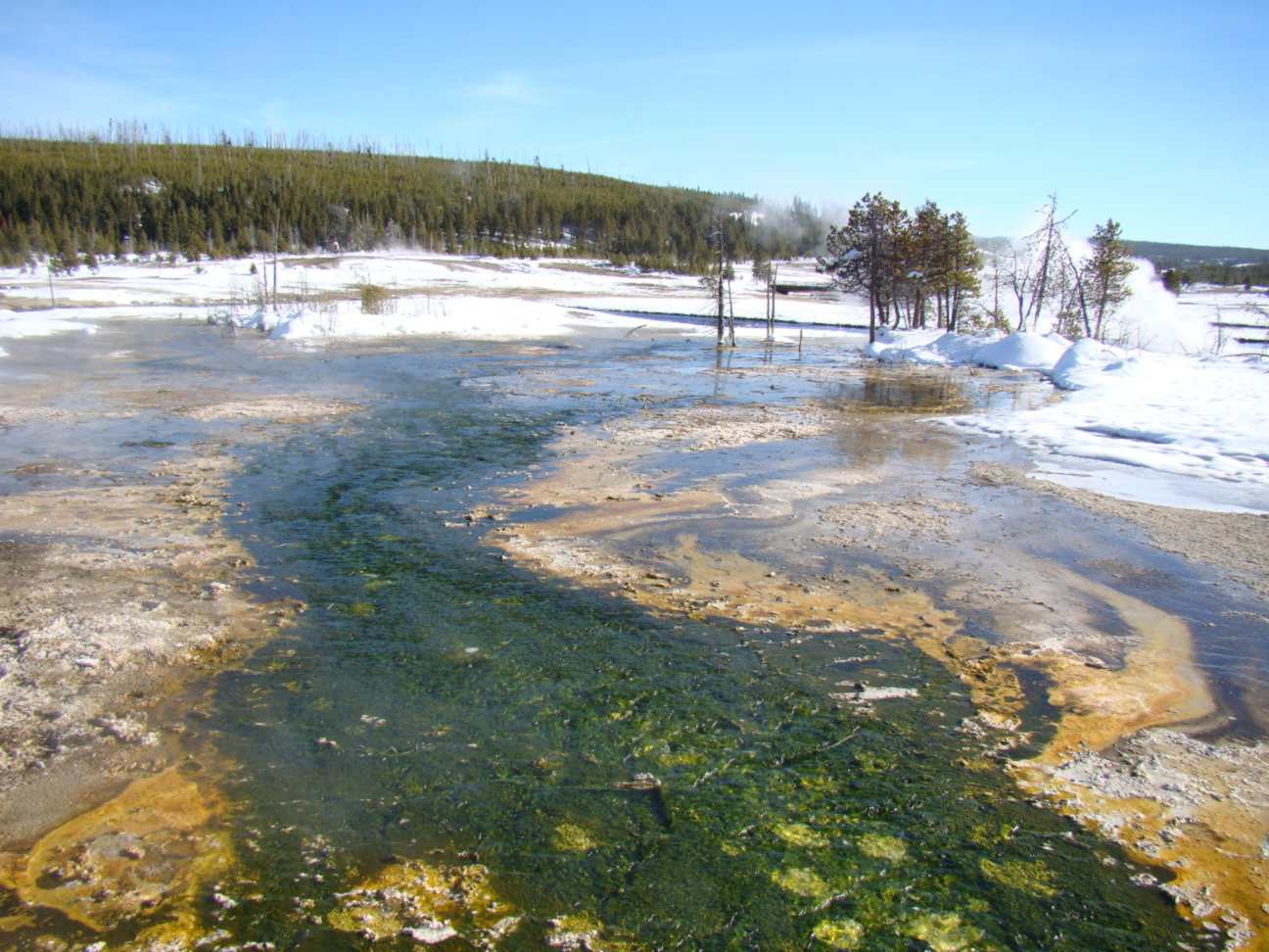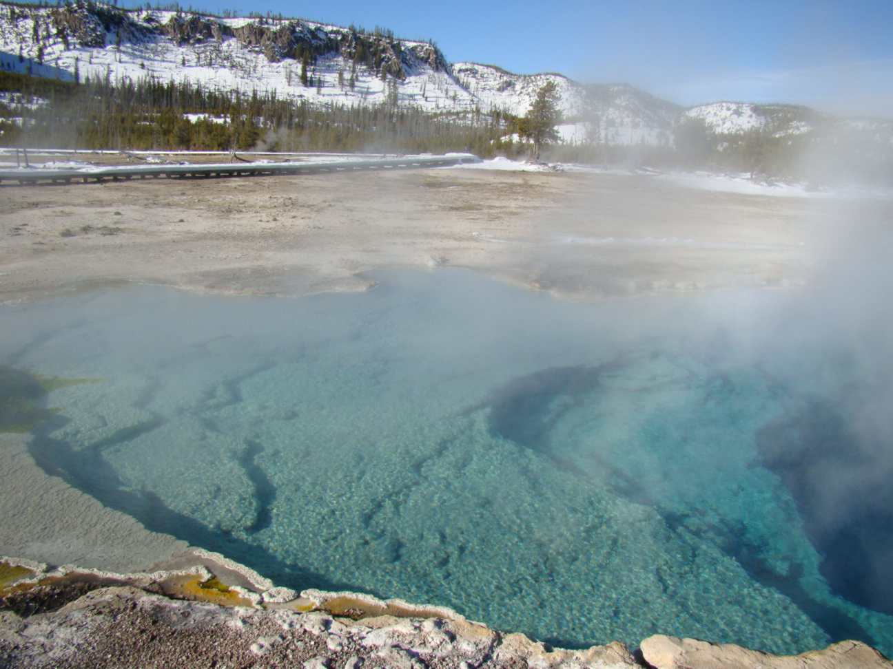 Isso aí em cima é um hot spring, uma piscina de água fervendo. Este era um gêyser que explodiu há mais ou menos 10 anos e se transformou nessa piscina linda. Há 2 anos atrás um cachorro pulou aí dentro, e o dono desesperado, pulou atrás. Os dois morreram cozidos. Morre-se em cerca de 15 segundos. O detalhe macabro é que o cara ficou com os olhos brancos e murchou.