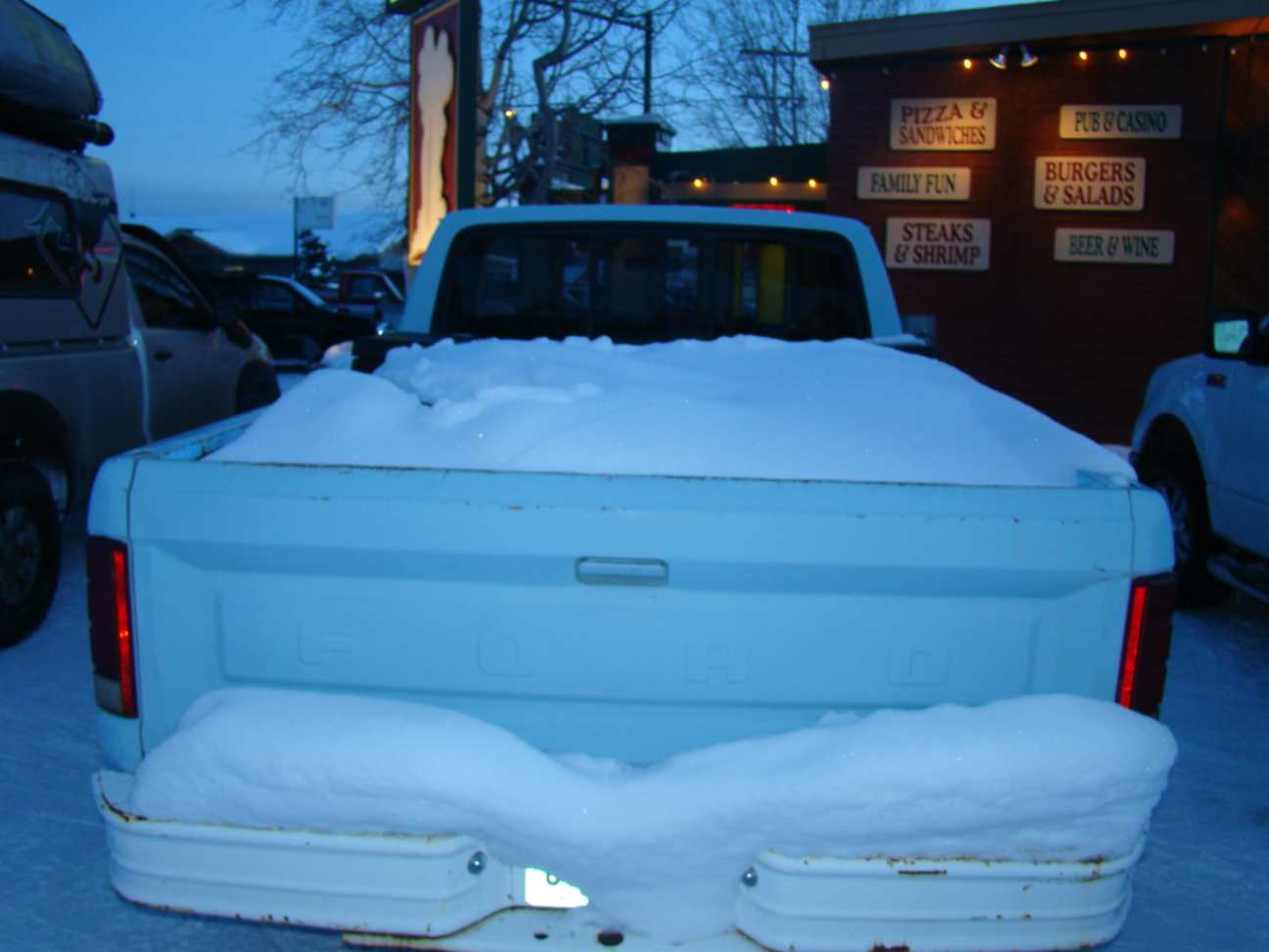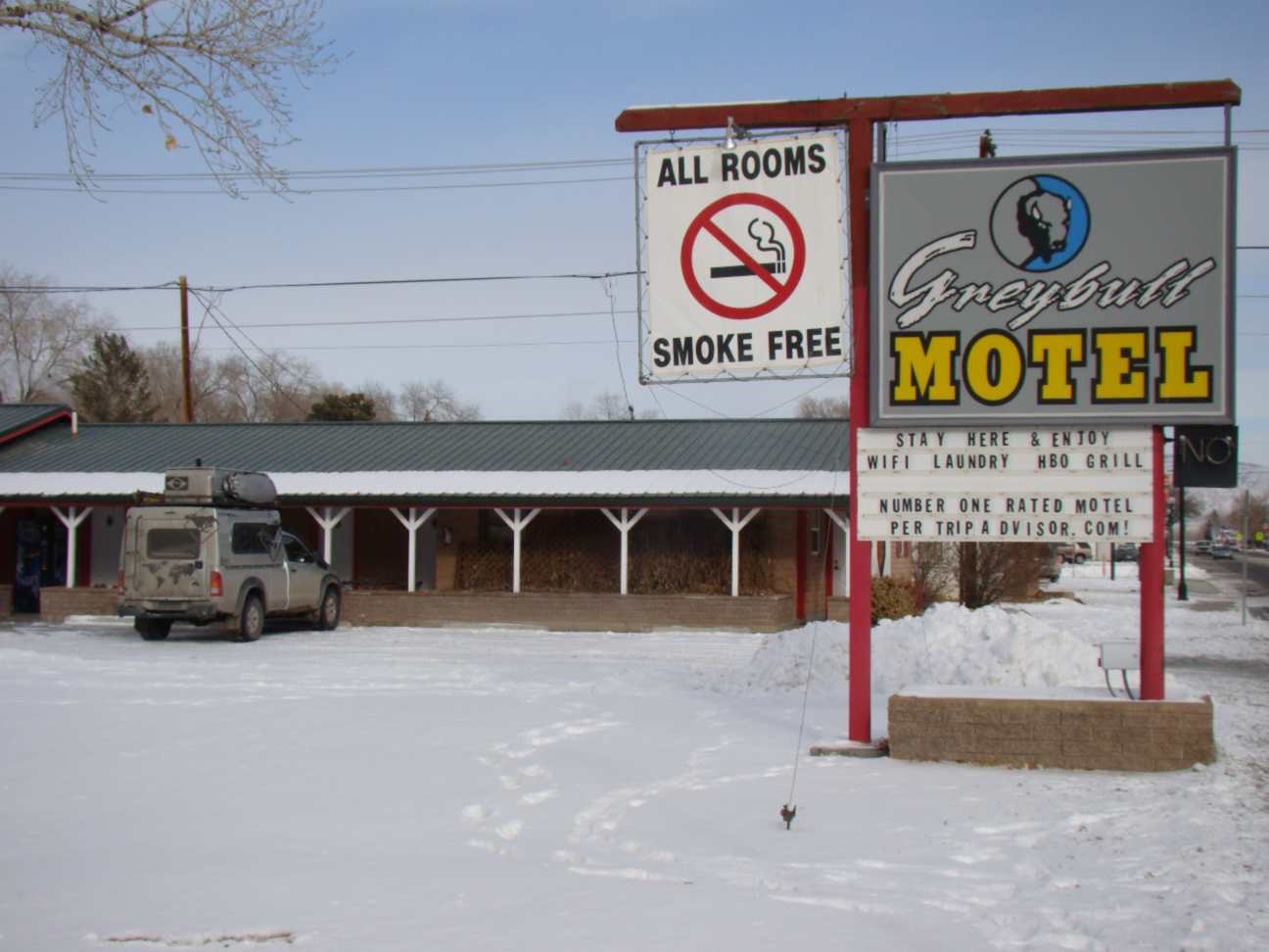 Ficamos presos na pequena cidade de Dayton por causa de uma forte nevasca e por isso não conseguimos seguir viagem. Mas isso não foi motivo de tristeza, pois aproveitamos para tomar uma cervejinha, o que é cada vez mais raro no nosso dia a dia. Primeiro, pois quando paramos estamos muito cansados e só queremos dormir, e também por causa do frio que continua intenso. Fomos a um restaurante chamado “Legends” quase na frente do camping onde passamos a noite.