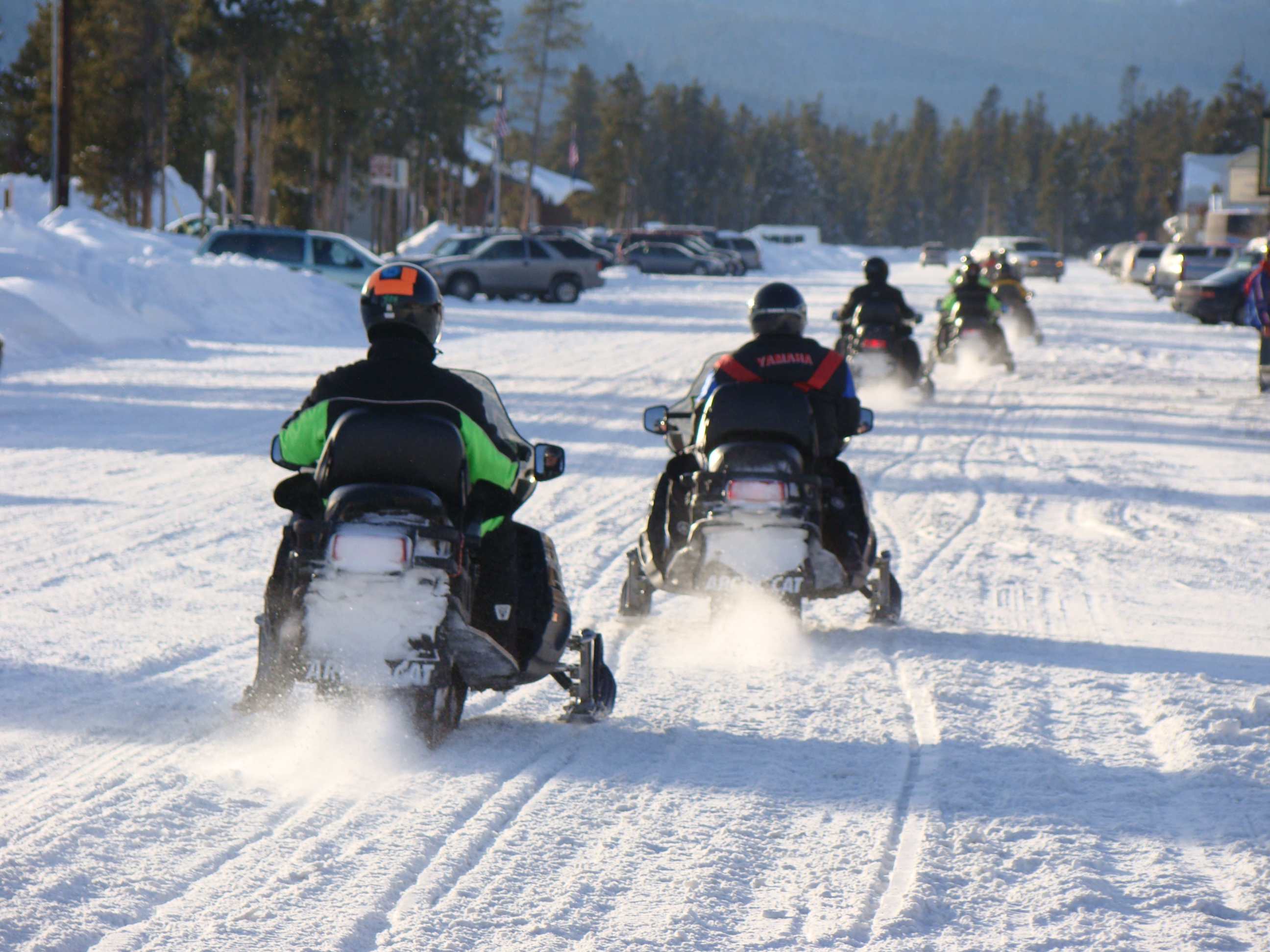 Carros e snowmobiles disputam o mesmo espaço.