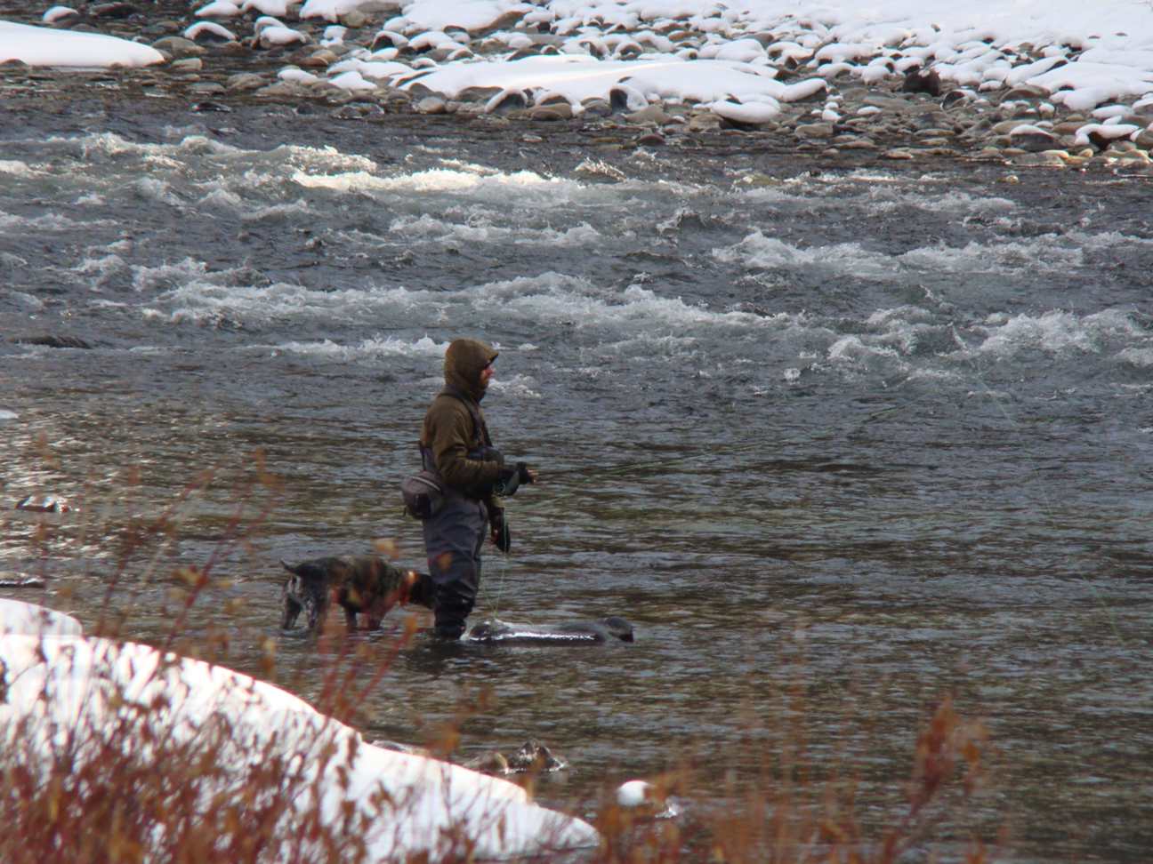 Com gente pescando no rio...