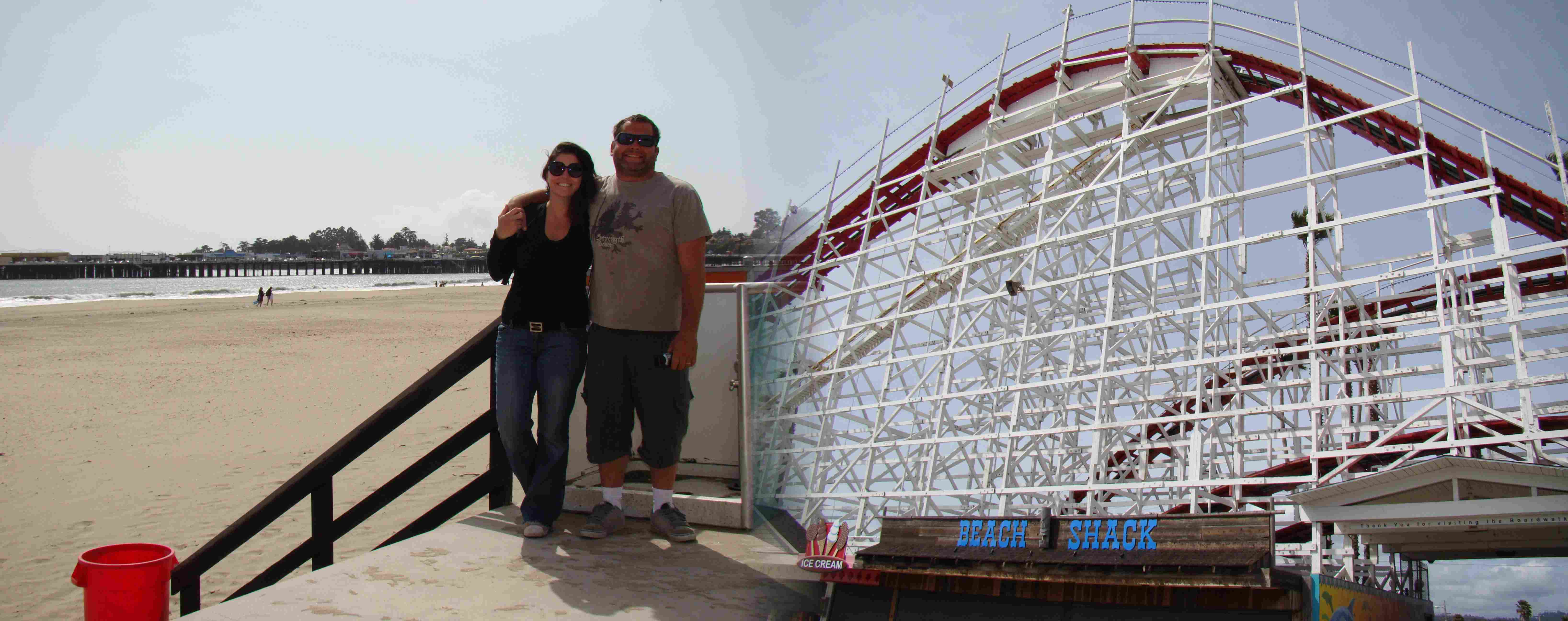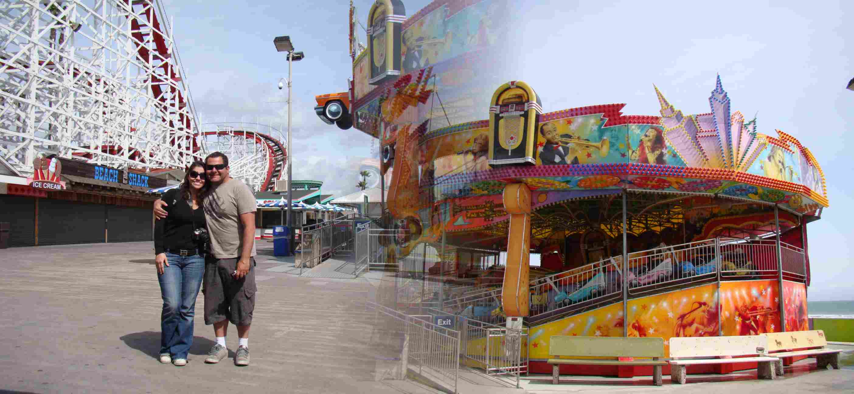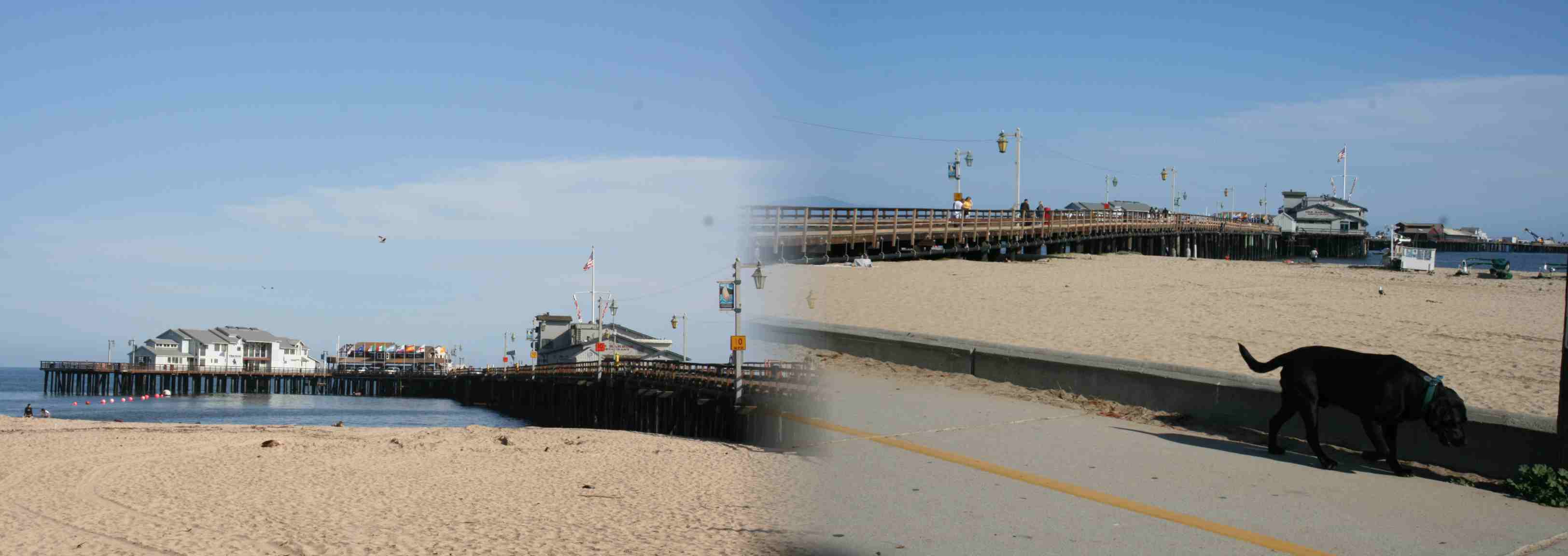 Na praia, além de uma marina coalhada de barcos há um tradicional píer californiano.