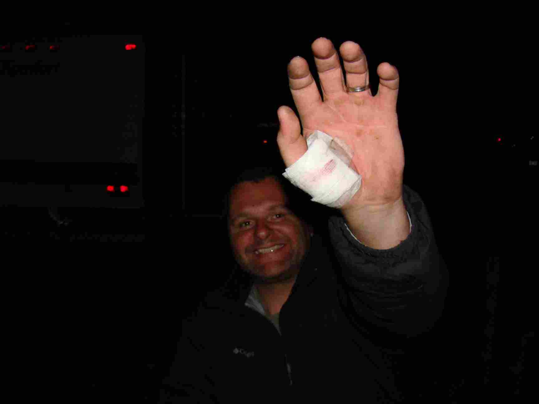Tava dando tudo certo demais. No final do trabalho todo faltava apenas cortar um enforcador de plástico para poder molhar a goela com uma cerveja gelada, mas o canivete, dos grandes, escapou e encravei a faca na minha mão! Corte super profundo com as tripas aparecendo! Que bosta! E lá fui eu para o hospital pela oitava vez nesta viagem!!! Juro, já fui para o hospital mais vezes nessa viagem do que em toda a minha vida! Vou trocar o nome do site para viagenshospitalares.com e a Ana vai abrir uma coluna de remédios maneiros.