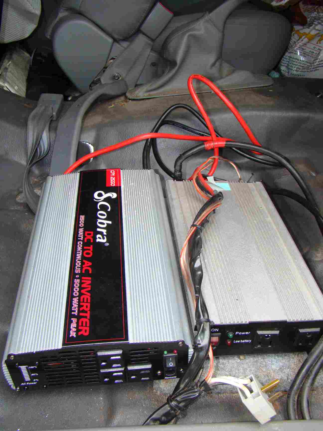 Arranquei o banco fora e instalei mais um inversor. Agora de 2500 watts com picos de 5000 watts. O microondas pode funcionar folgado, além um fogão elétrico, forno elétrico e cafeteira. Afinal no Farofamóvel não tem botijão de gás, pois ocupa muito espaço e o plug é diferente em cada país.
