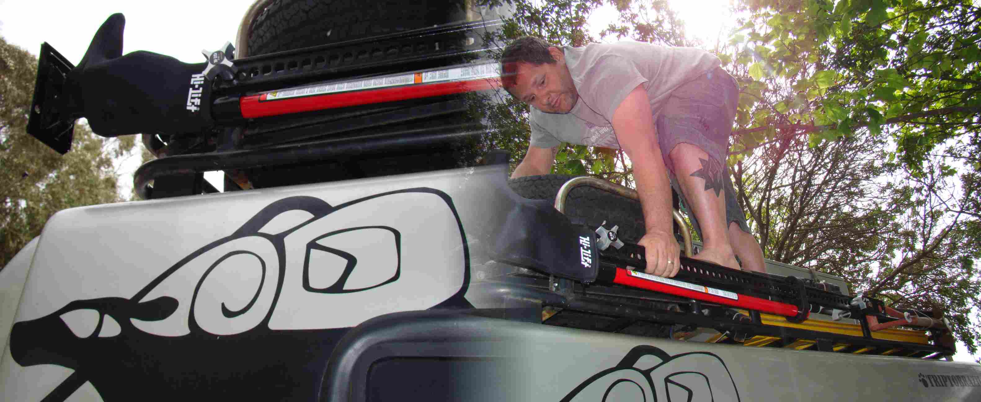 Instalei no rack um Hi-Lift que é um macaco que eleva o carro até mais de um metro do chão. Excelente para desatolar em areia e lama. Aqui é muito mais barato, claro.