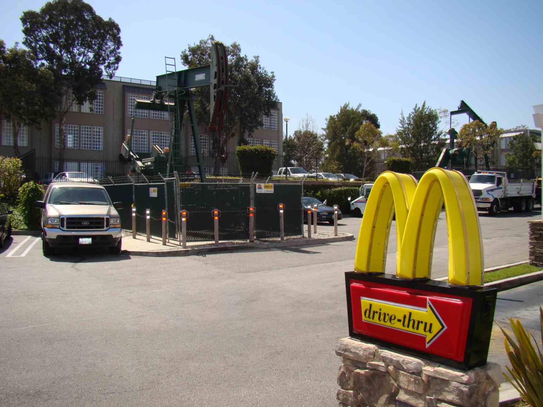 Outra curiosidade na Califórnia são os diversos poços de petróleo espalhados pela cidade. São centenas deles em lugares surreais, como este no estacionamento do Mc Donalds.