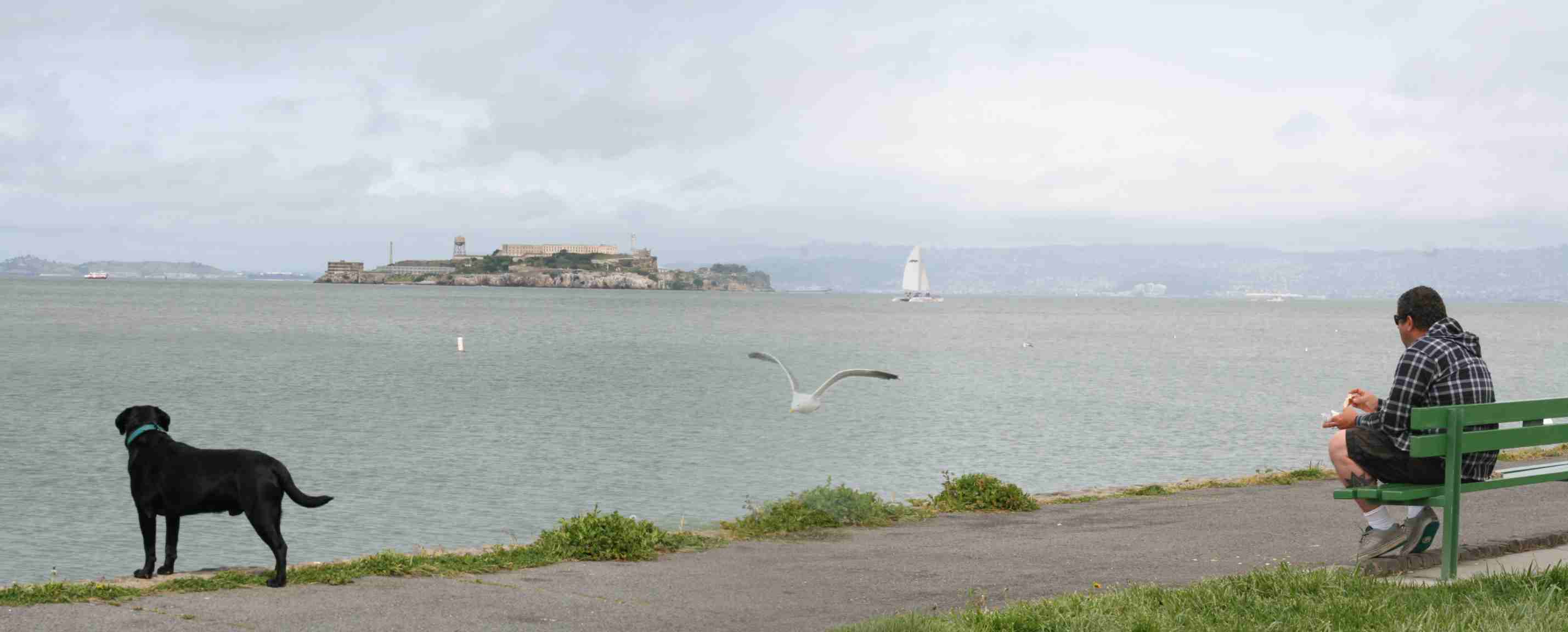 Sentados na orla, comemos Bowl Bread, um pão com formato de panela com sopa dentro, de frente para a ilha onde está o presídio de Alcatraz...