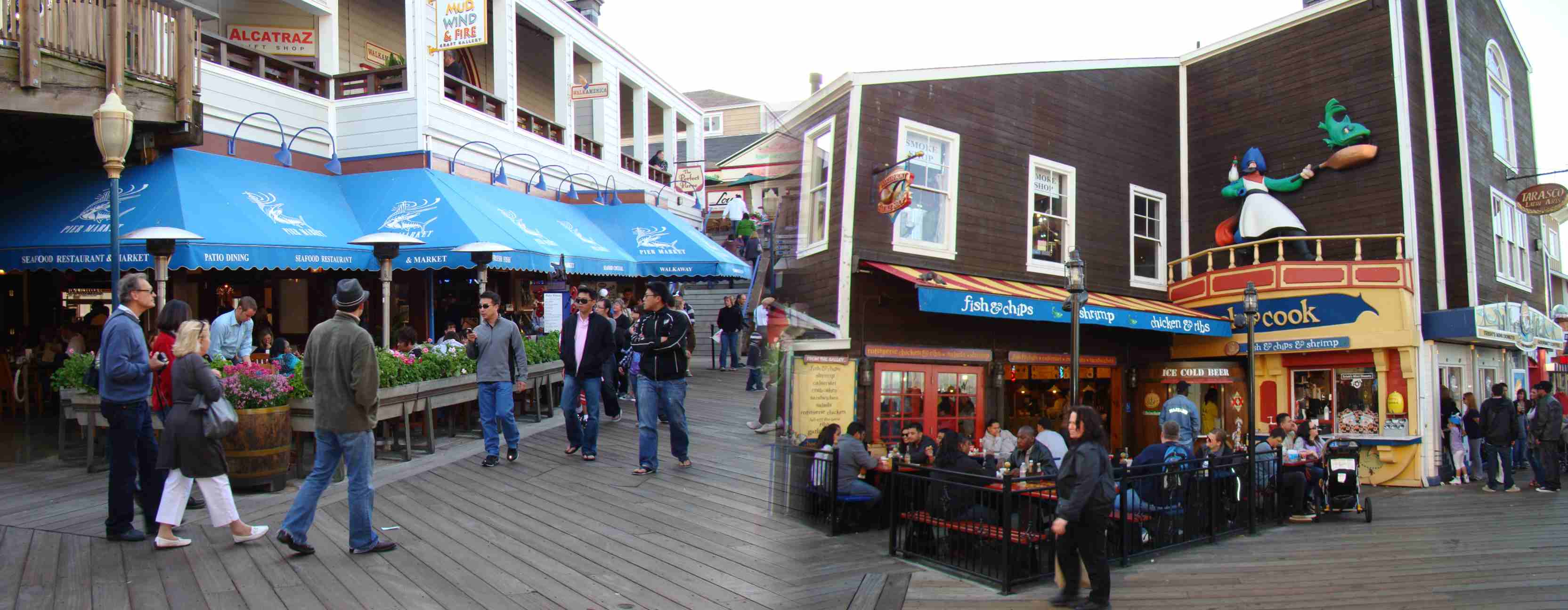 Aqui tem o animado Pier 39, um lugar com vários restaurantes, bares e lojas.