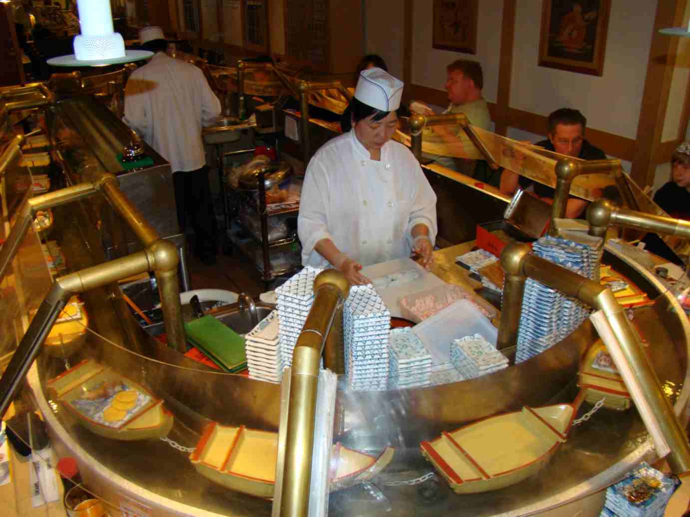 Ali você tem a opção de sentar à mesa, ou sentar em volta do bar, onde passam uns barquinhos boiando na água com as comidas. Muito parecido com os restaurantes japoneses no Rio e em São Paulo que colocam as comidas em mini esteiras. Cada pratinho tem seu preço e você pega qual quiser. Os preços variam de US$ 2,00 a US$ 4,90.