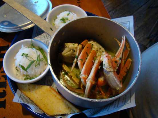 Assim como todas as outras bebidas servidas na casa, você pode ficar com o copo que bebeu pagando uma pequena quantia. Para comer pedimos Steamed Crab Legs composto por caranguejo ao molho de alho e ervas, arroz com jasmim e pão com ervas. Delicioso!