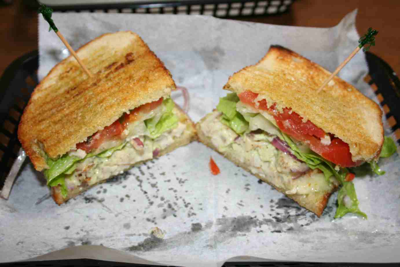 - Beck´s Germany: Cerveja de fabricação alemã... não poderia ser ruim. Não lembra nem um pouco as tradicionais e pesadas cervejas alemãs, e é muito saborosa. Na charmosa cidade de Carmel paramos para fazer uma boquinha num café super aconchegante chamado “Café Carmel”. Quem for ali não pode deixar de comer esses dois sandubas que experimentamos e que vimos serem pedidos por muitos clientes. O primeiro chama-se Chicken Pesto. Para quem conhece a deliciosa culinária italiana, pesto é um molho de manjericão com nozes feito para comer com massas... este sanduba foi feito com pão ciabatta molhado com ervas, peito de frango, molho pesto, salface, tomate, cebola rocha e especiarias. Estava D-I-V-I-N-O!