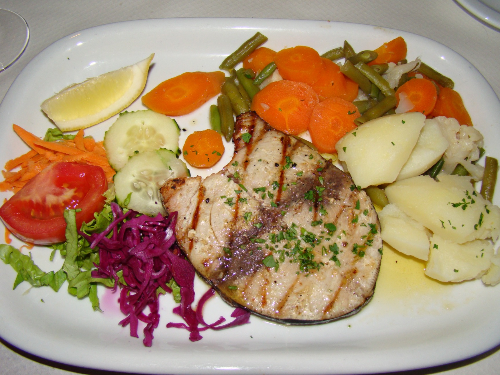 Em nossa primeira noite comemos um delicioso peixe chamado “Halibut”. Eu pedi grelhado...