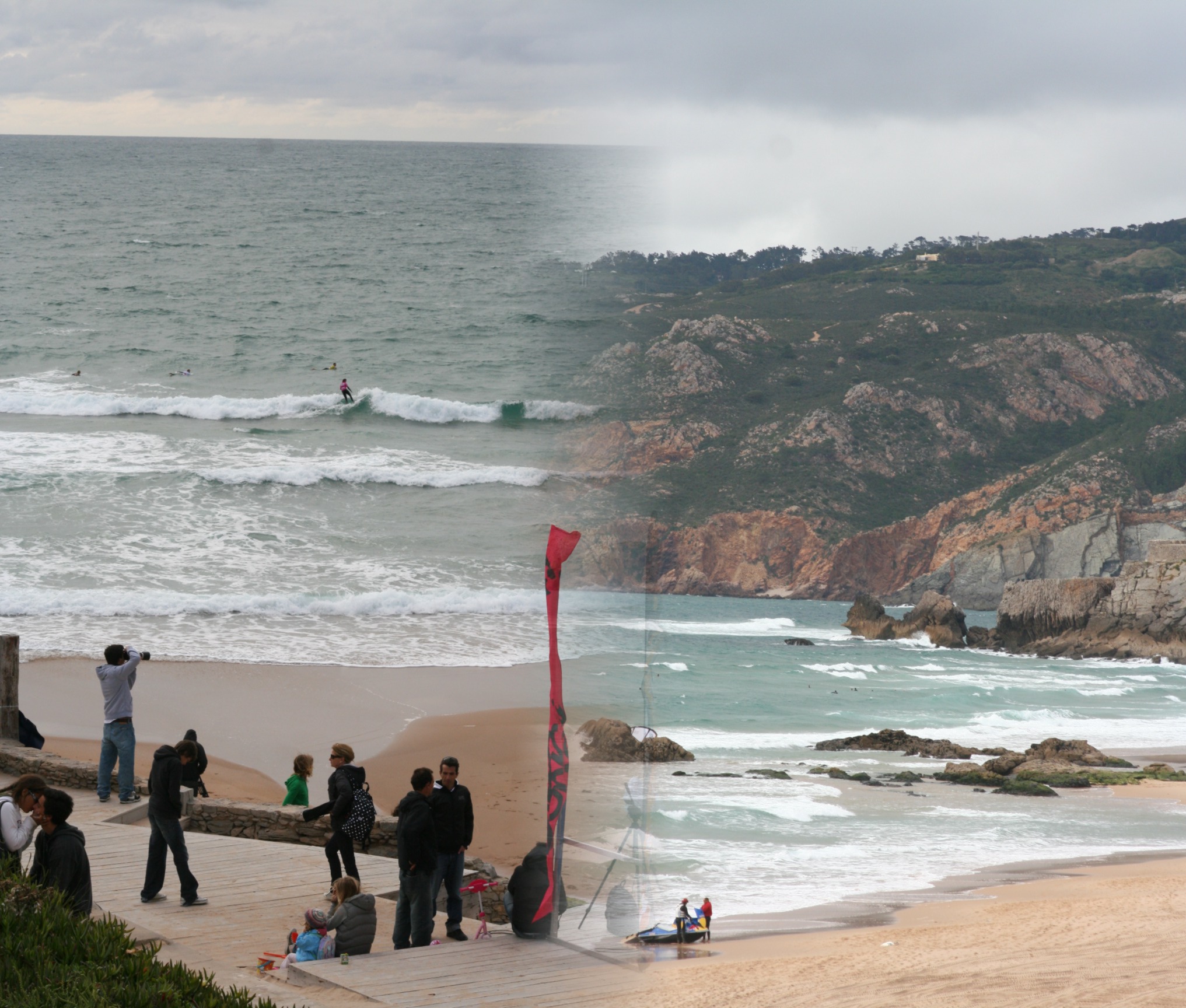 Fomos na Praia do Guincho. Nesse dia estava acontecendo um campeonato de surf apenas para mulheres.