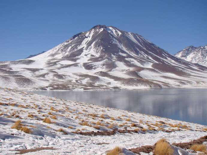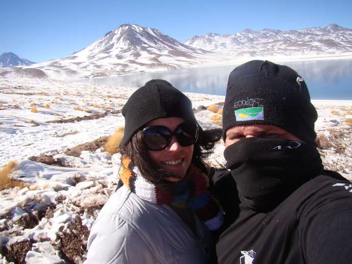 Fomos visitar a Laguna Miscanti. Lugar lindo... Uma montanha cheia de neve com um lago congelado aos seus pés.