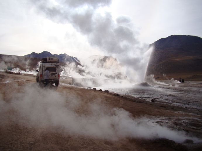 O passeio agora seria o mais legal de todos. Os gaisers do El Tatio. O lance é que tem que acordar muito cedo e encarar uma estrada moedora de veículos de 150 km. Se chegar depois da 9:00 da manhã perde o espetáculo e os gaisers ficam broxas.