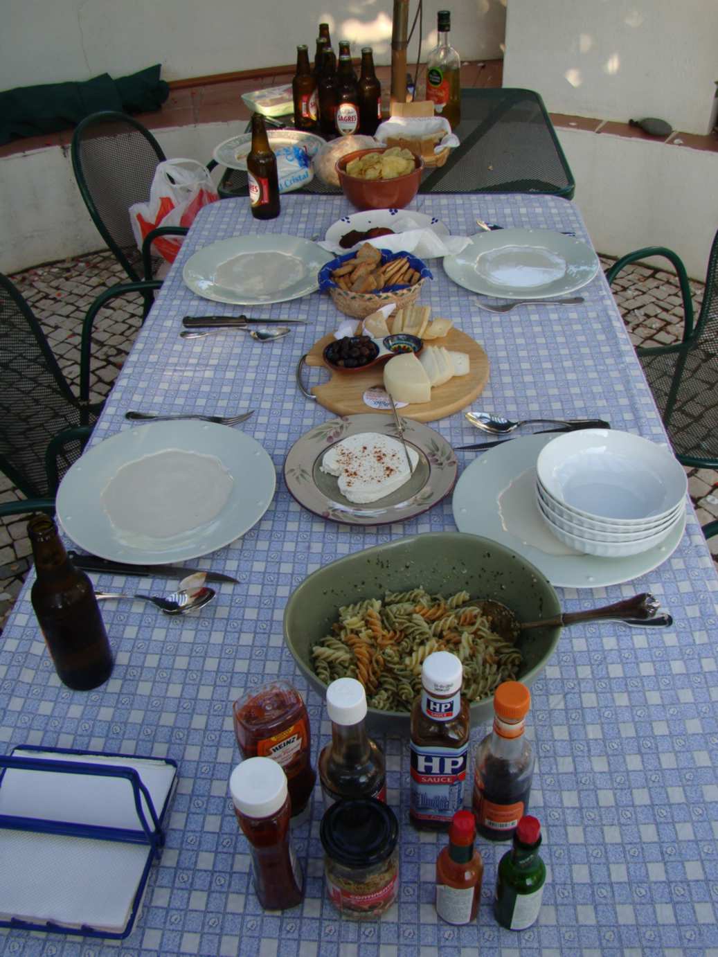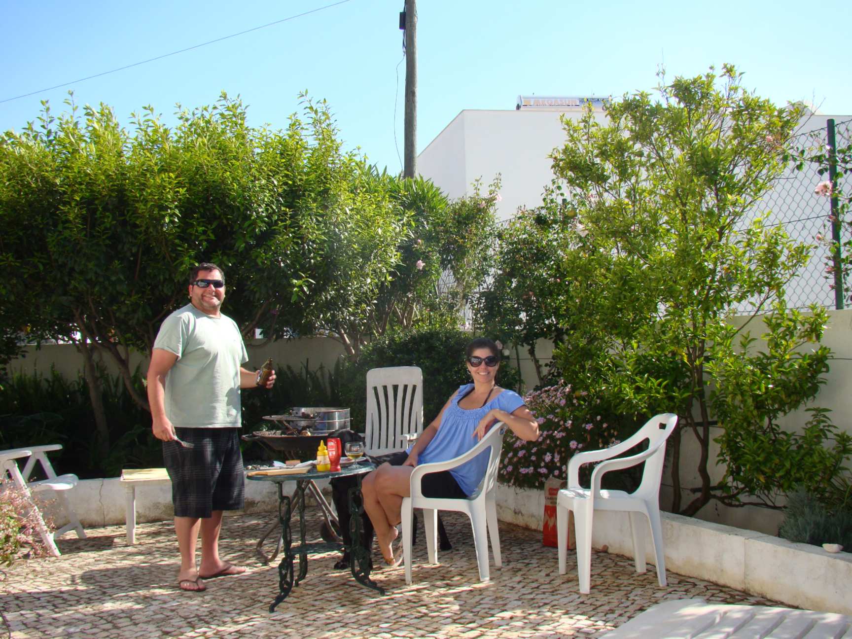Voltando ao churrasco, fizemos a “churrascada” de despedida com alguns alimentos emblemáticos de nossos países. Fizemos costela de porco, bolinho de bacalhau, queijos e vinhos lembrando Portugal...
