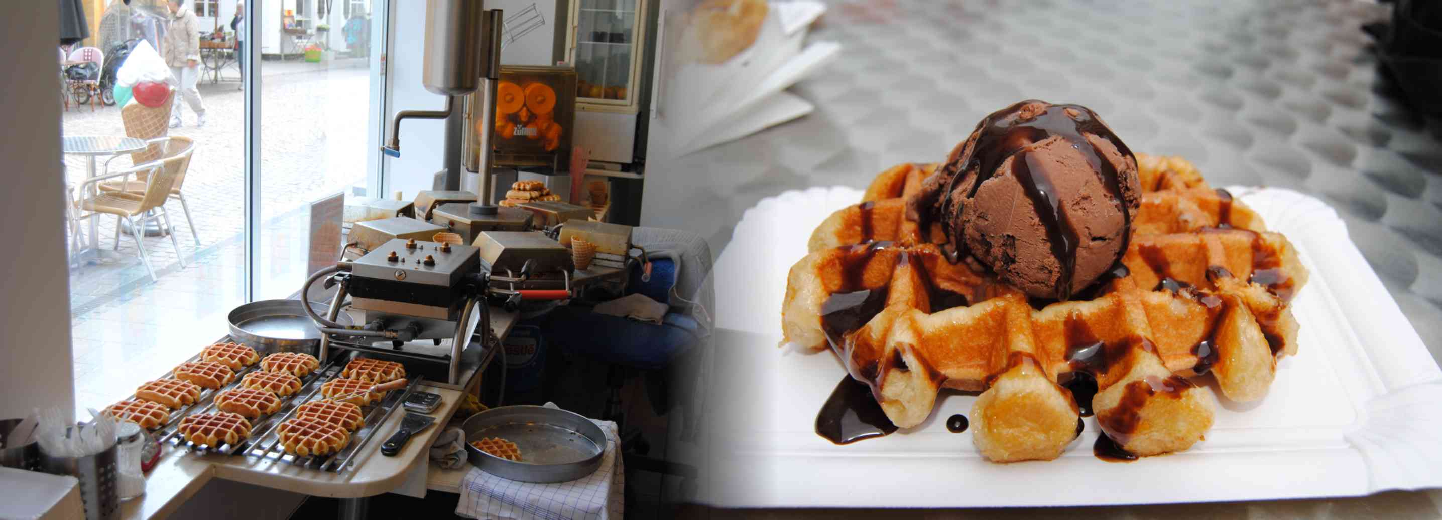 Aqui o waffle também faz sucesso, só que é bem diferente dos que comemos nos EUA. Os de lá são bem menos doces que os daqui e os daqui têm a massa mais pesada. Mas nem por isso são menos gostosos... ainda mais com sorvete e cobertura de chocolate. Delícia!!