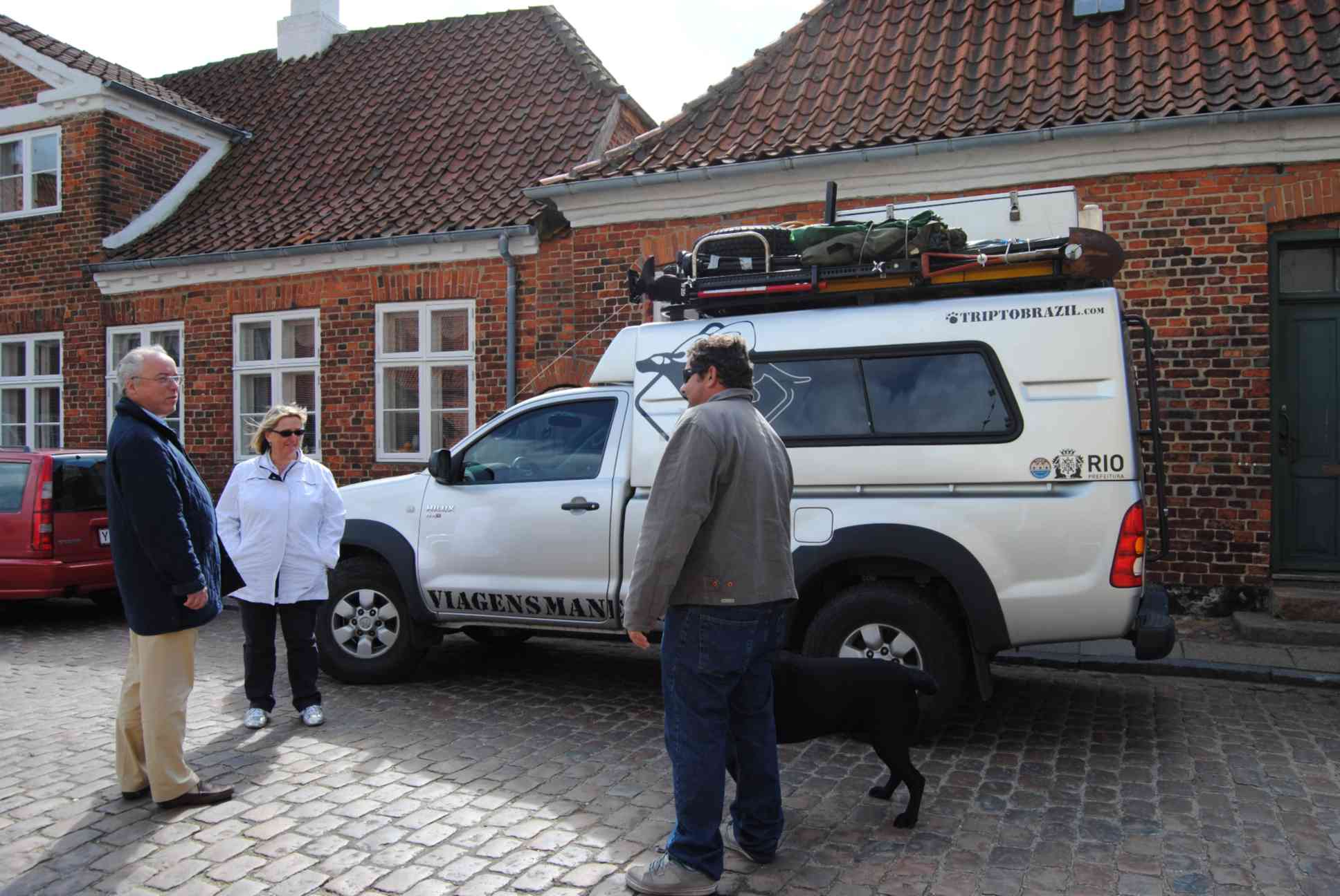 Aí chegou o Flemming Nygaard com seu labrador preto, abriu um mapa gigante no capo do Farofamovel e começou a dissecar a Escandinavia para a gente. Mostrou onde é o lugar que Shakspeare escreveu Hamlet, a Legolândia, o cemitério dos monarcas e os lugares que ele gosta de caçar javali na Suécia. Cara bacana, nos deu duas lanternas maneiras da sua empresa.