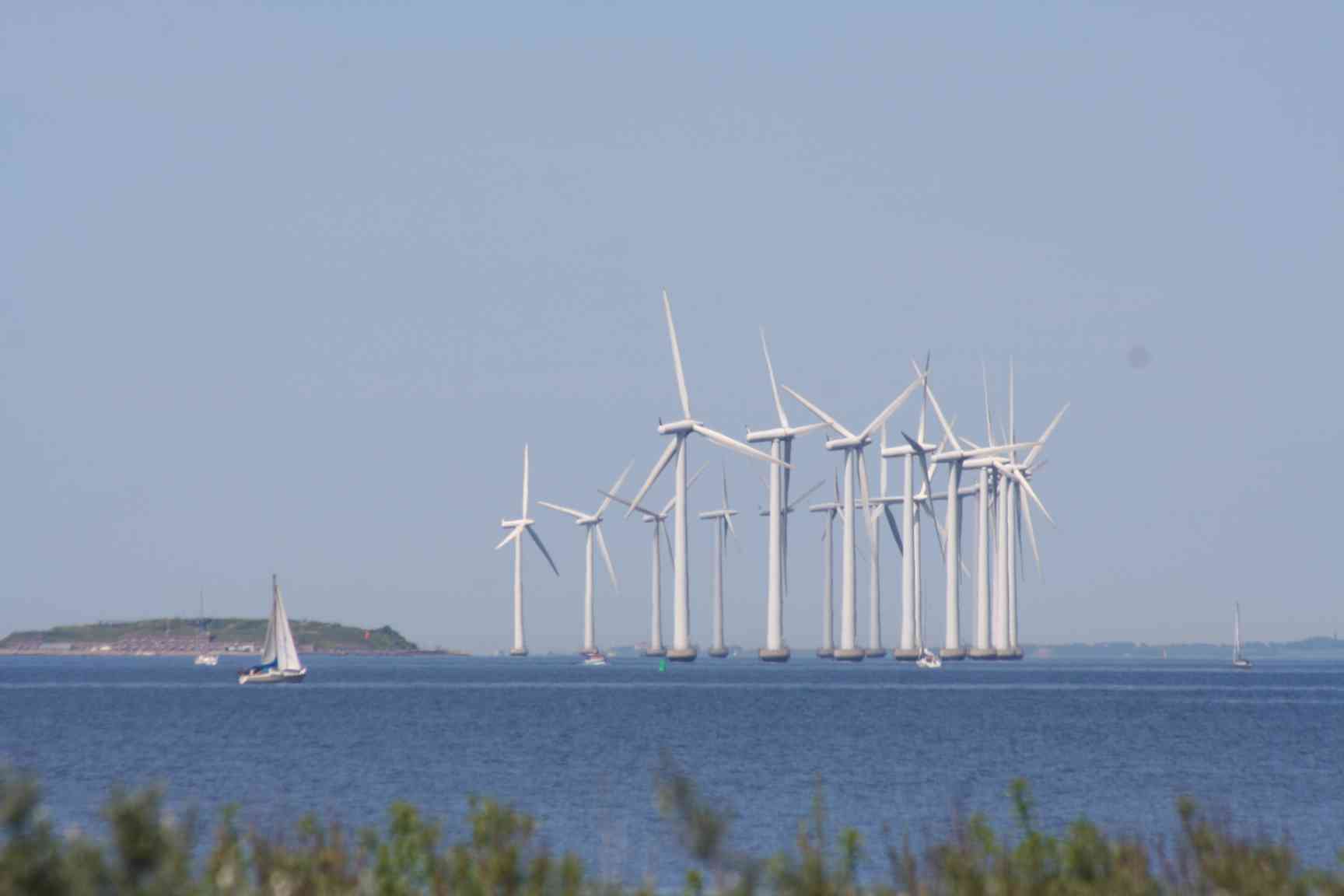 Passamos por geradores eólicos que ficam no mar. Os veleiros velejam entre eles. É a maior viagem...