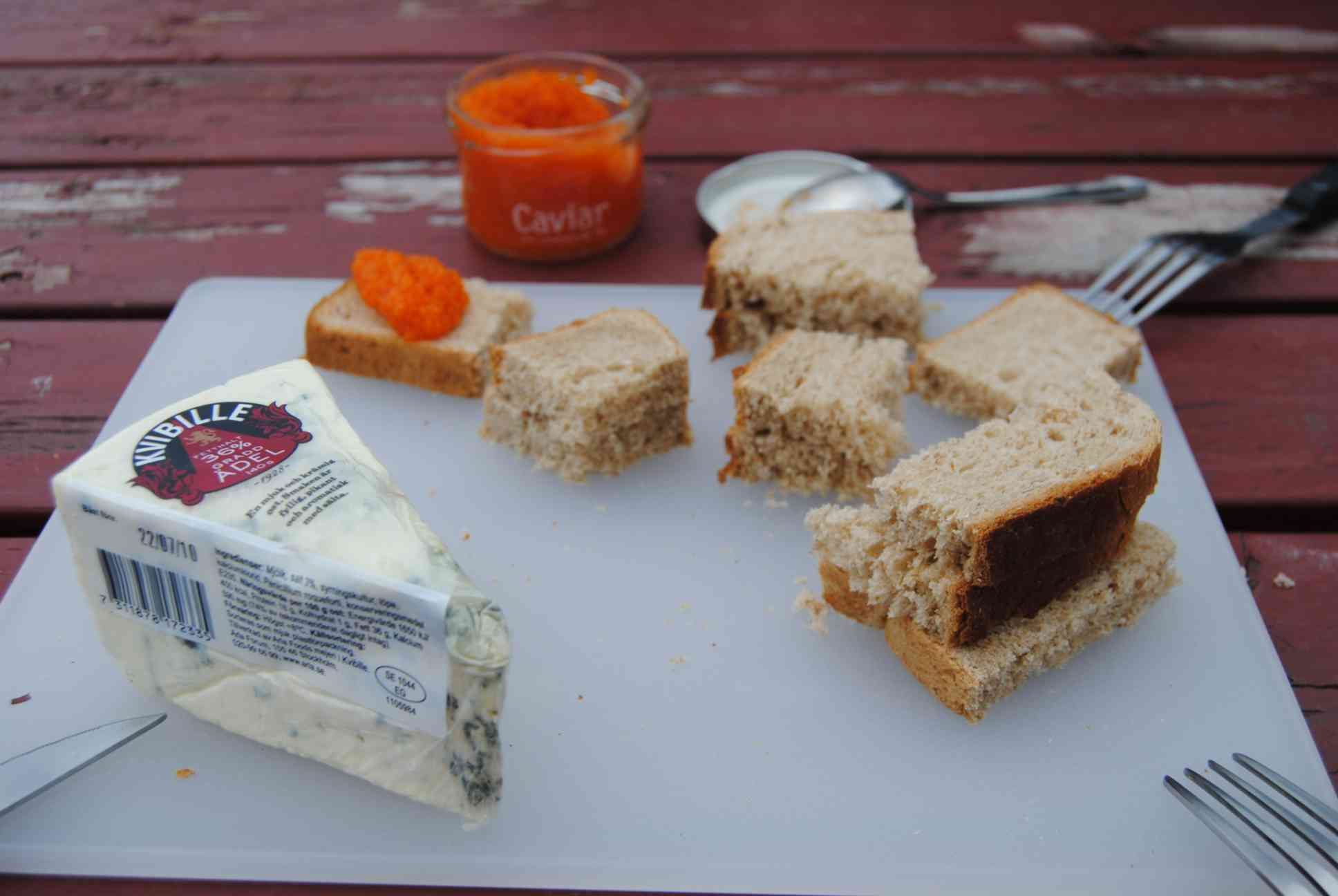 No jogo que do Brasil x Costa de Marfim, preparei alguns aperitivos para comermos com alguns desses caviares e também com um delicioso queijo sueco. Aliás, um dos melhores que provamos em toda a viagem.