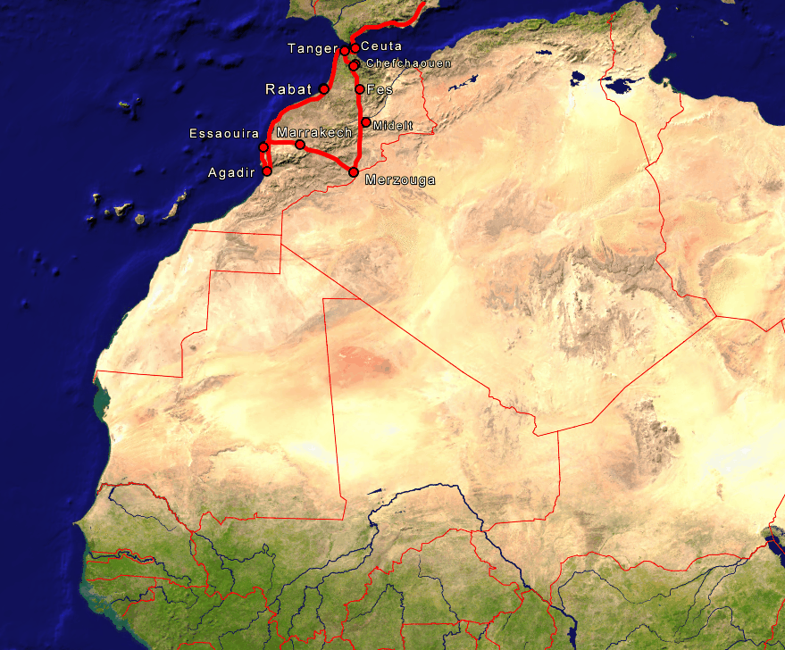 Cruzamos a cordilheira dos Atlas. Essa cordilheira se formou quando a América e a África se colidiram há milhões de anos atrás. Hoje seu pico tem mais de quatro mil metros de altitude e neva no inverno.