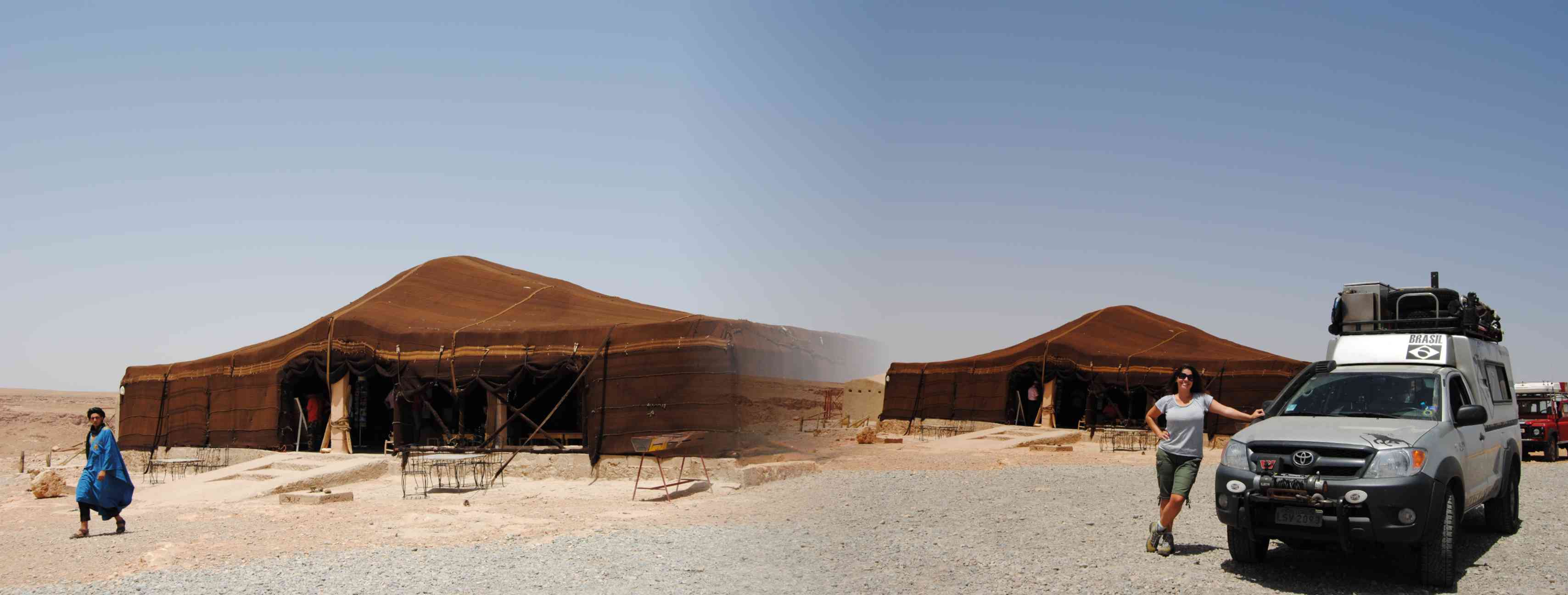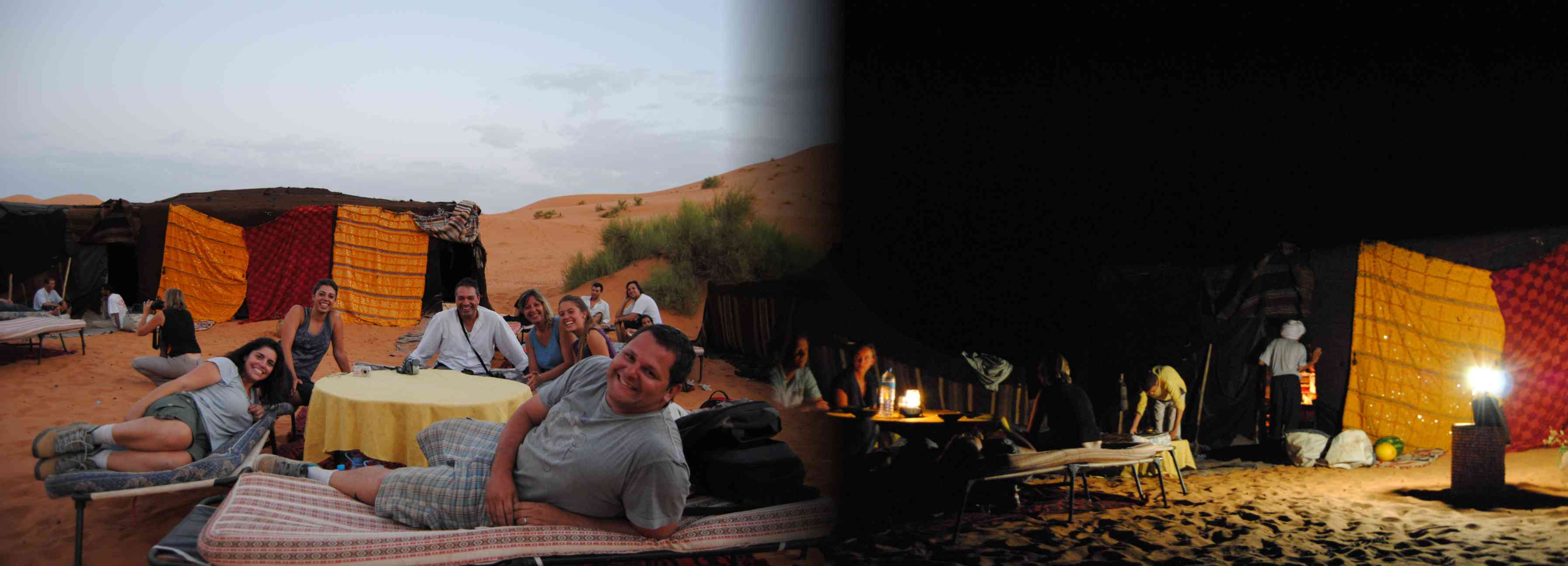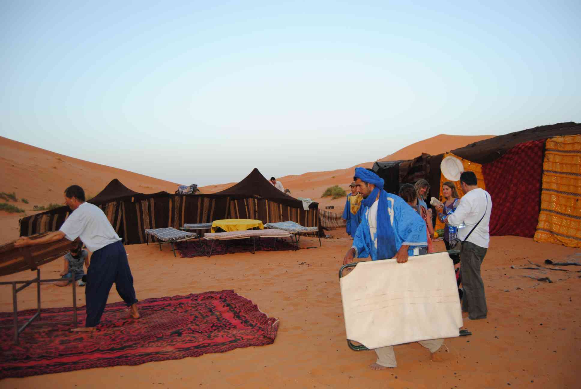 Os berberes armaram mesas e tapetes para a gente no meio do deserto.
