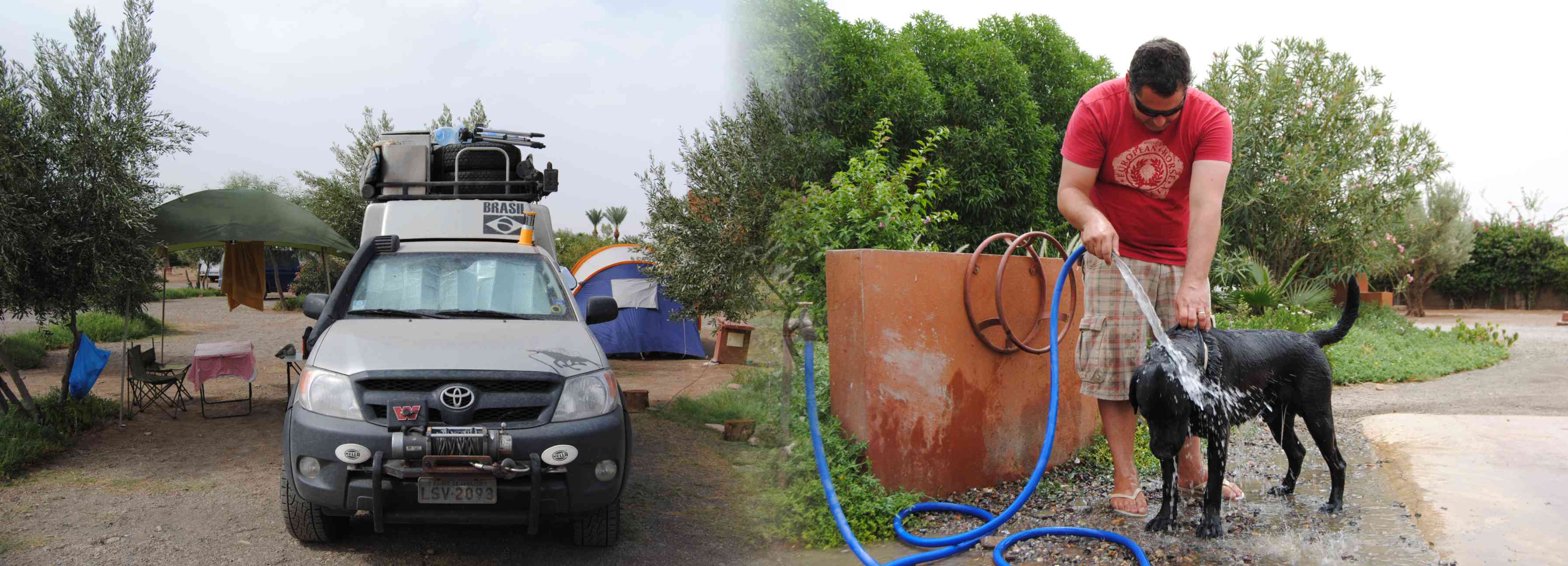 No camping em Marrakech nossa “sombra” era um pé de azeitona de um metro de altura. Estava um calor de matar. O Tapa estava passando muito perrengue.