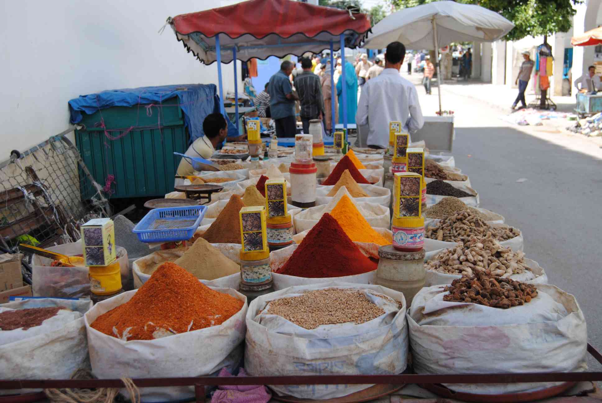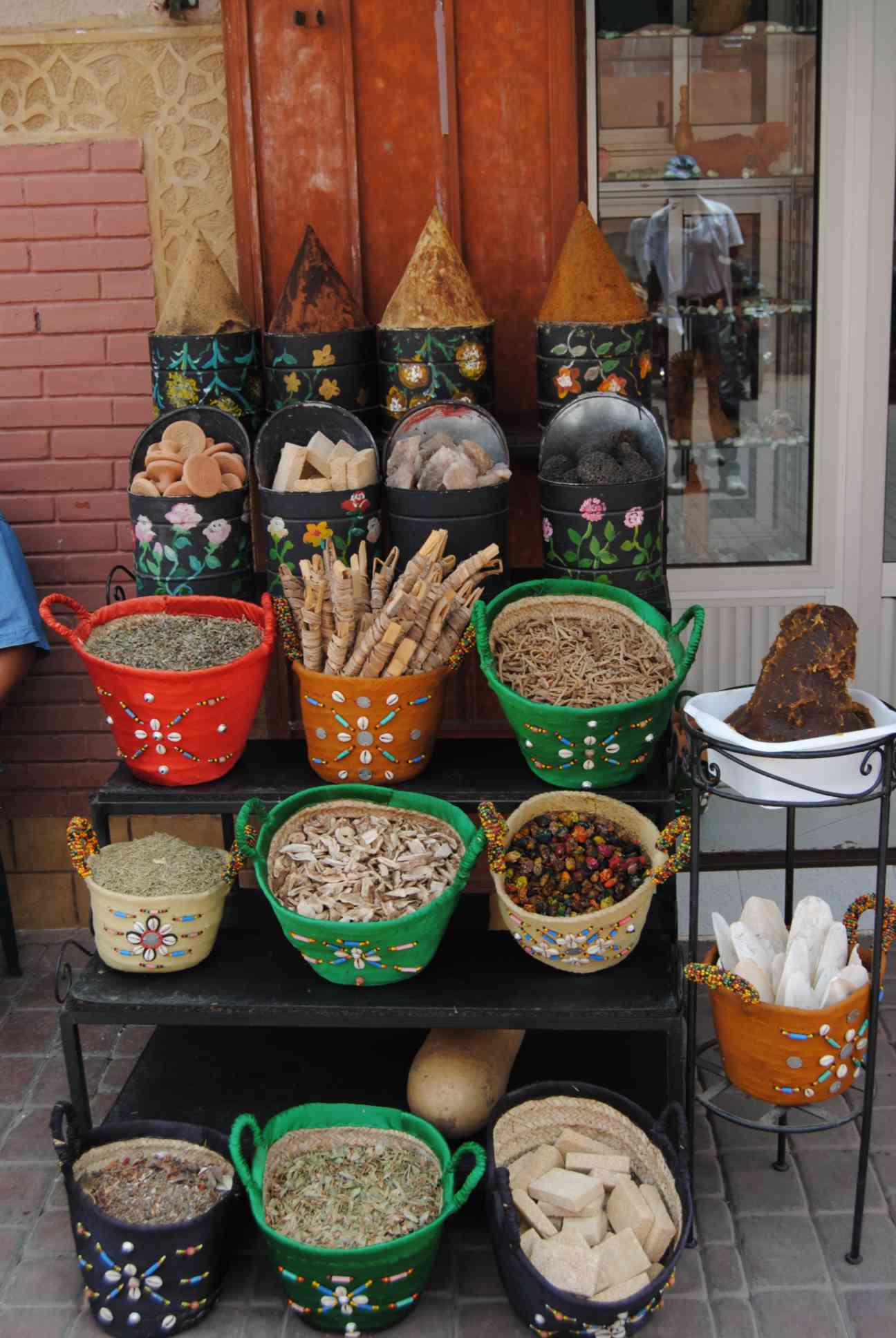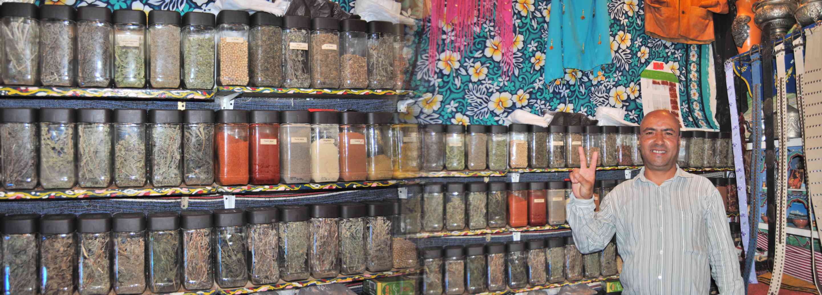 O açafrão talvez seja o mais famoso, mas também existem muitos outros utilizados por lá... páprica, anis, cominho, gengibre, pimenta, gergelim e outros. Dá para se perder no meio de tantos. Além de ser um prazer para o olfato, é um prazer para os olhos. Além de seus temperos e especiarias, o país também é famoso por suas ervas com fins medicinais. Não é difícil encontrar lojinhas que vendem ervas para todos os fins, como essa que fomos em Chefchaouen...