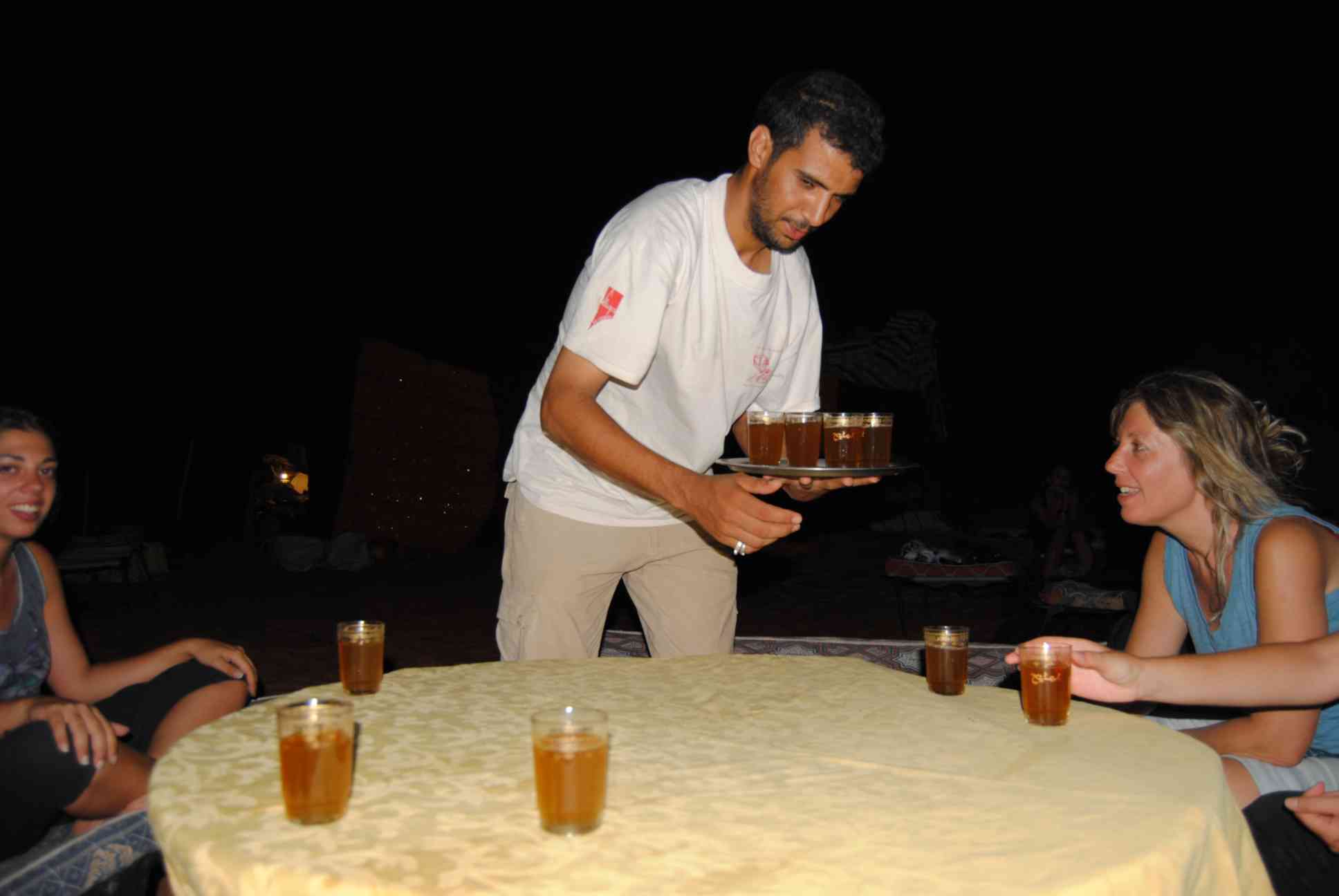 Pedimos kafka e carne de carneiro na brasa. Ambos estavam ótimos! Aliás, a carne de carneiro é muito consumida em todo o país e uma das mais baratas também. Enquanto no Brasil paga-se uma fortuna para comer um pequeno pedaço, no Marrocos é possível comer fartos pedaços super baratos. Essa é outra boa pedida para quem for por lá. Alguns lugares servem a carne com couscous. Imperdível! Em Merzouga fizemos um inesquecível passeio de dromedário, o camelo árabe, pelo deserto. Depois de duas horas caminhando pelas dunas fomos recebidos em nosso acampamento com o delicioso chá de menta...