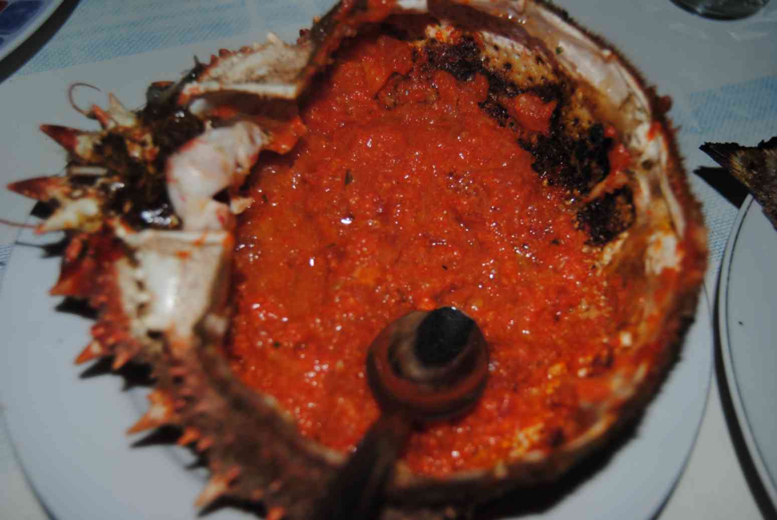 ... quanto quer comer e pede para pesar. Depois disso começa a negociação para chegar a um preço viável. É fama do país os vendedores SEMPRE colocarem os preços das coisas muito acima do valor justo, portanto negocie! Depois de chegarmos a um preço justo para nós quatro... comemos um molho com as ovas do caranguejo...