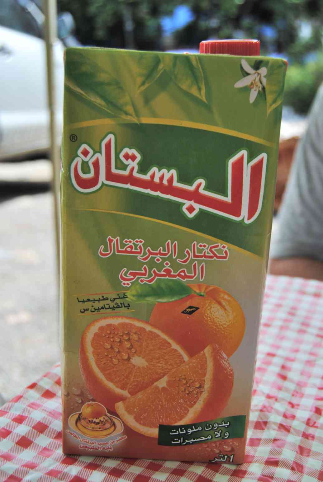 ... mas a massa é muito mais pesada, porém é um pão bem gostoso. Não tivemos problemas para comprar comida em nossa passagem por lá, mas era engraçado ver as embalagens dos alimentos escritas em árabe... como esse suco de laranja.